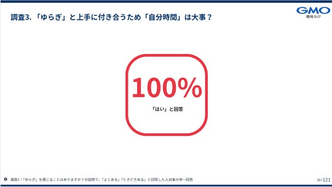 「ゆらぎ」と向き合ううえで「自分時間が大事」と答えた人は 100% にのぼりました。自分の時間を持つことがセルフケアの必須要素であることが明らかになりました