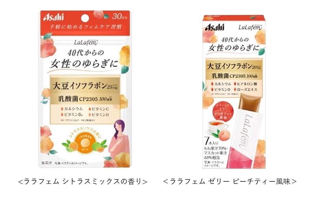 「ララフェム」は、年齢とともに変化するゆらぎ世代の女性が、毎日を楽しく、自分らしく輝けるように応援したいという思いから誕生した商品です。大豆イソフラボンとアサヒグループ独自素材の乳酸菌CP2305などを配合し、生活スタイルに合わせて選べる粒タイプとゼリータイプで展開します。