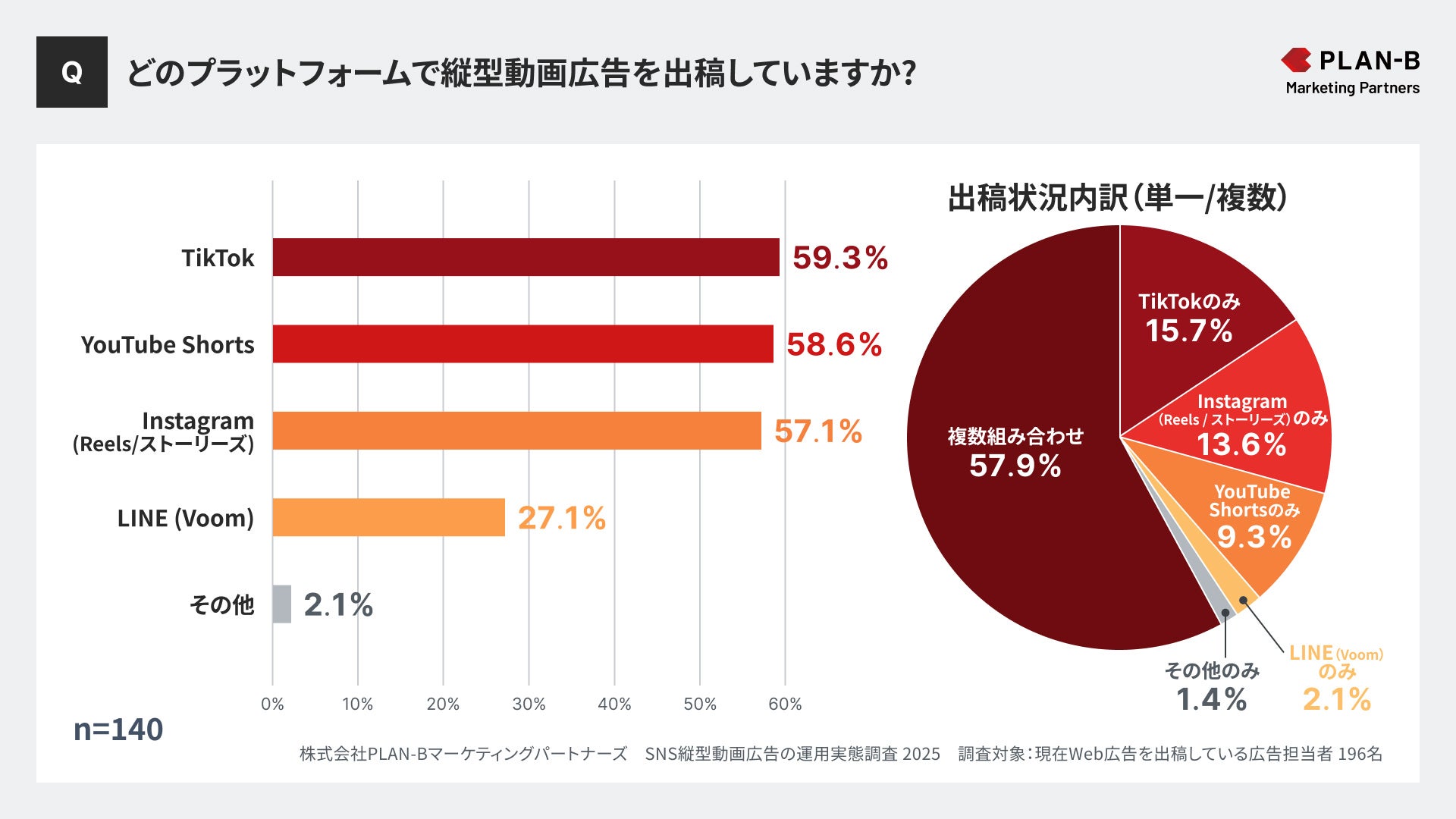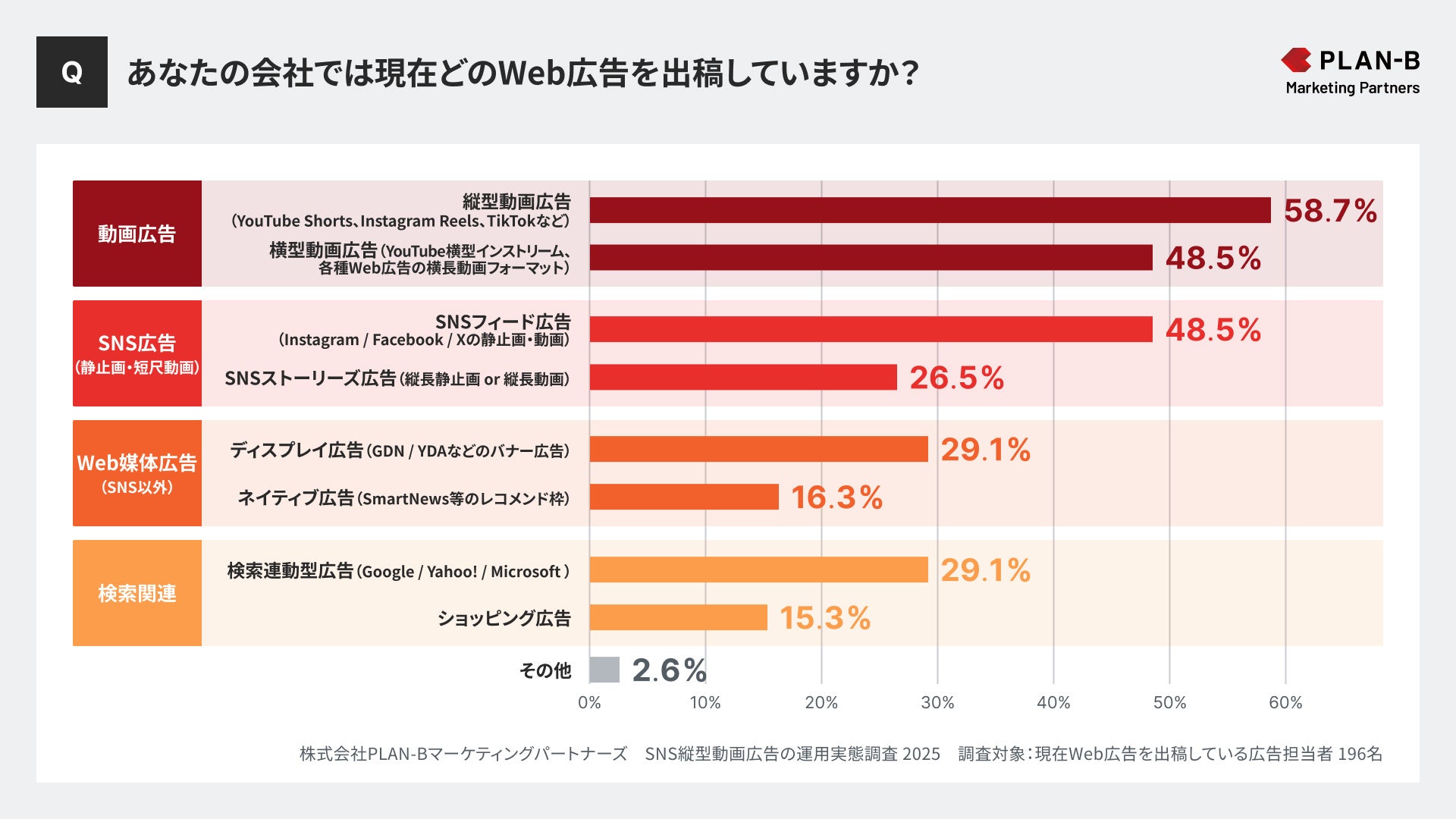 Web広告・SEOなどあらゆるデジタル領域のマーケティング支援を行う株式会社PLAN-Bマーケティングパートナーズ(東京都品川区、代表取締役:鳥居本 真徳)は、現在Web広告を出稿している全国の広告担当者196名を対象に、「SNS縦型動画広告の運用実態調査」を実施しました。