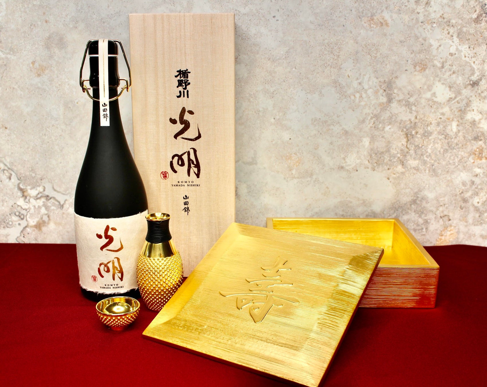 純金「お重+千呂利+ちょこ」セットに、酒米の王様といわれる山田錦を1%にまで磨き上げた究極の 純米大吟醸である楯の川酒造「光明」と松阪牛リブロースすき焼き用のお肉がセットになったスペシャルな 福袋です。