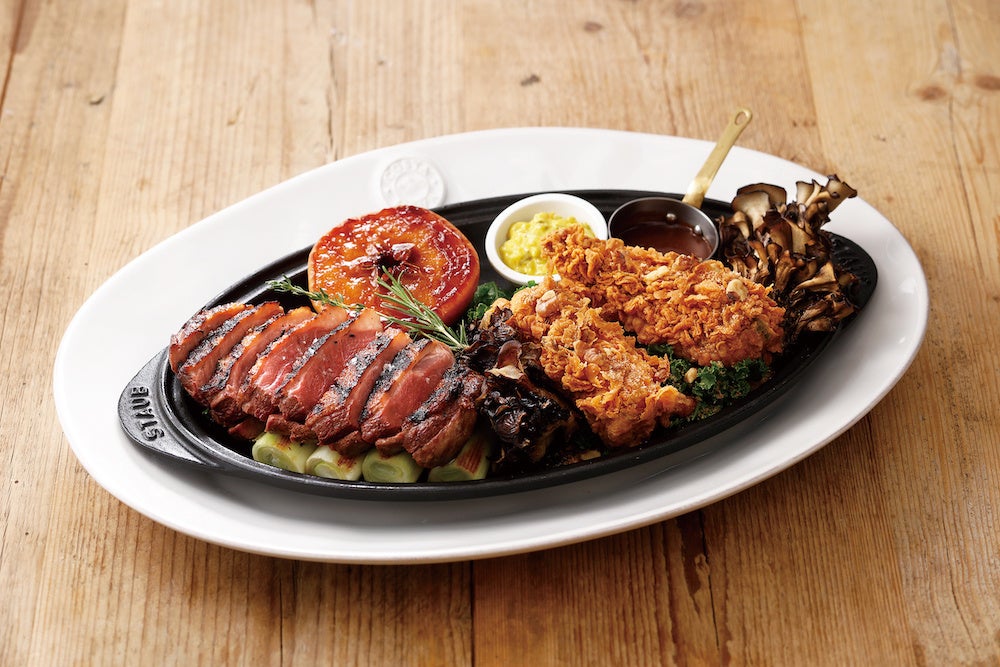大地の恵み“合鴨”と海の恵み“鮟鱇(あんこう)のフライ”を一度に楽しめる欲張りな一品。りんごのロースト、やわとろ葱、黒舞茸のグリルの3種の付け合わせと一緒に、今だけの美味しさをお楽しみください。