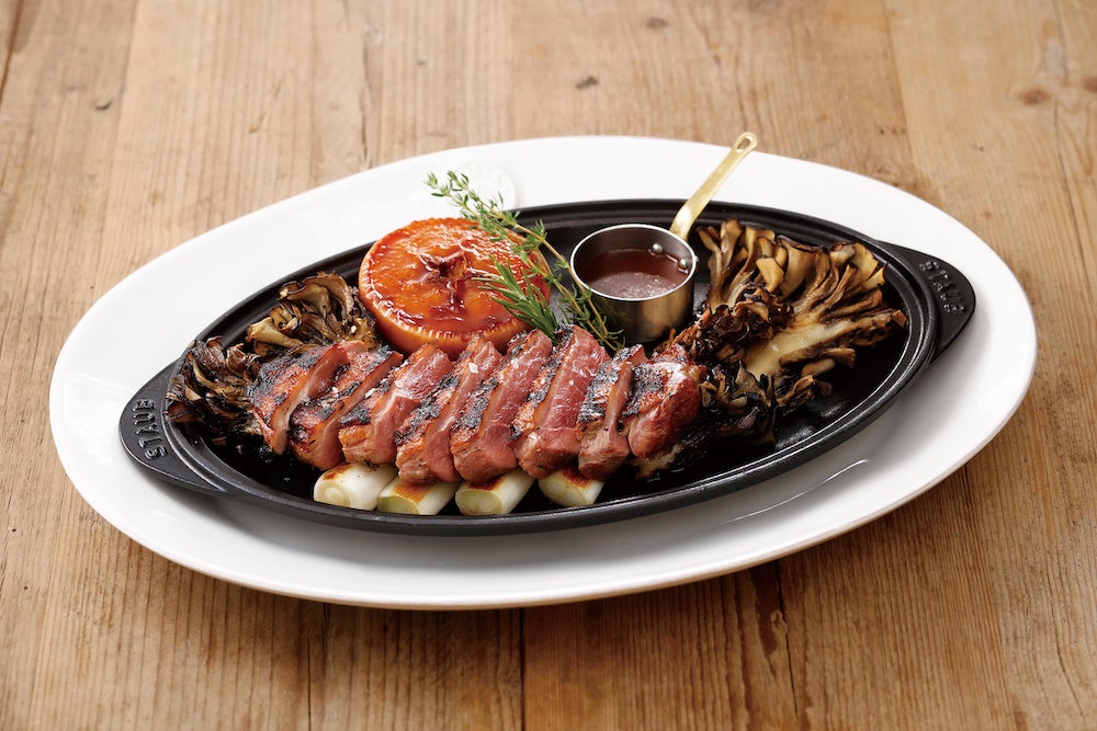 赤身が鮮やかな青森県産合鴨(バルバリー種)をグリルした後オーブンでローストしロゼ仕立てに。相性にこだわったやわとろ葱・りんごローストの付け合わせや赤ワインソースと共に鴨の香りを楽しめます。