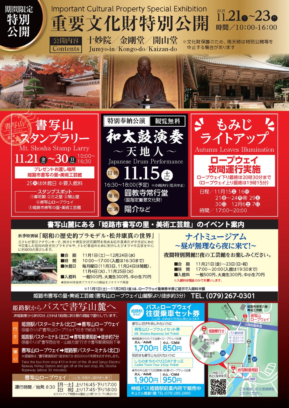 「書写山 もみじまつり」の開催期間中は大変な混雑が予想されますので、公共交通機関をご利用ください。
