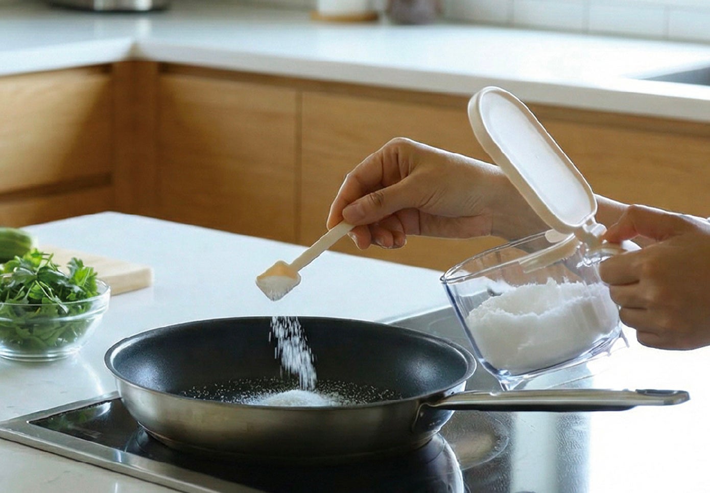 すり切り板を使えば小さじ(5ml/2.5ml)が簡単に量れるので、調味料を正しい分量で取りたいときに活躍します。
