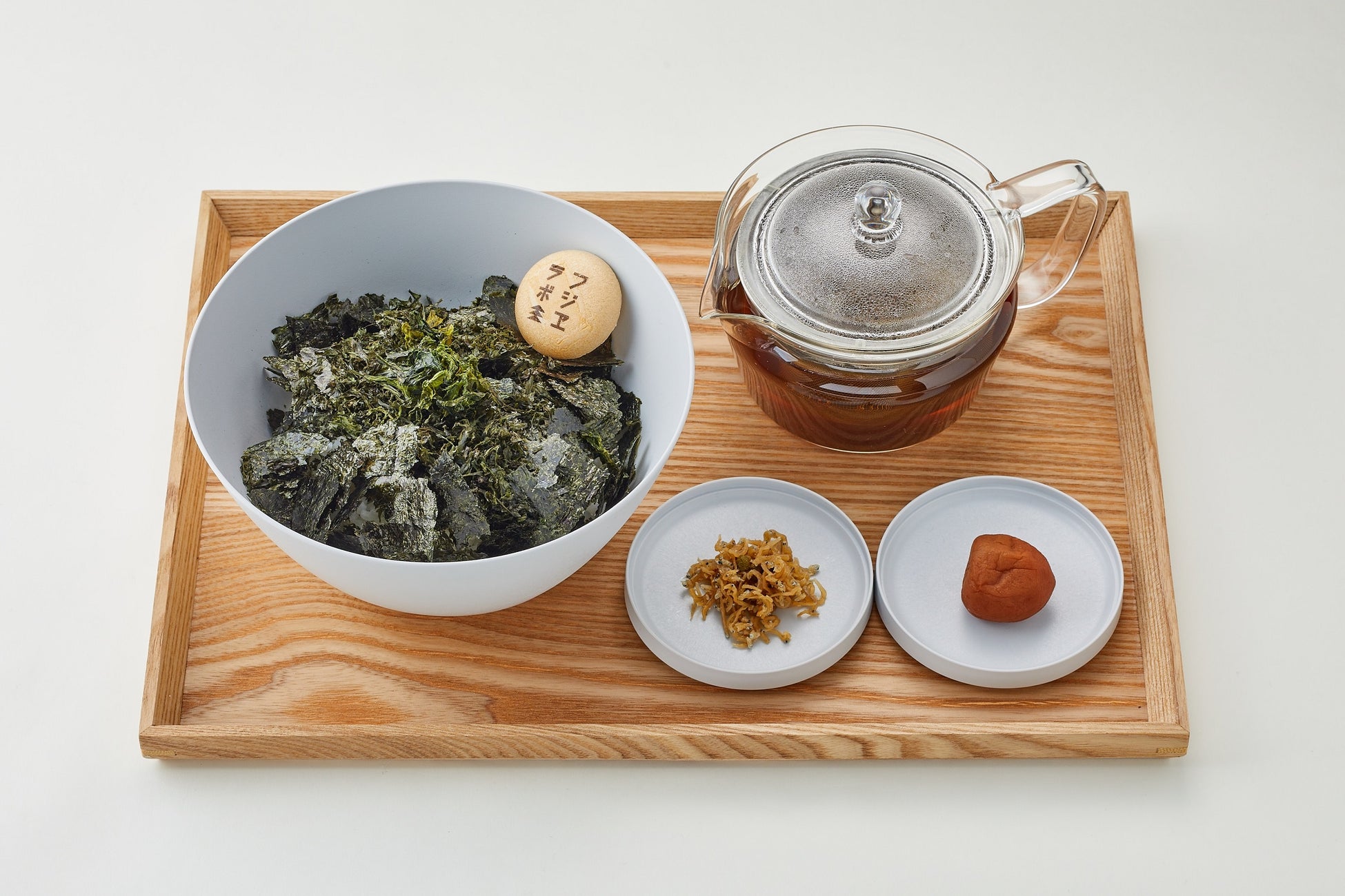 明海産板海苔、ばら干海苔、あおさ海苔の 3 種の海苔にかつお節、昆布、椎茸をベースにした自家製のほうじ茶だしをかけてお召し上がり頂く、山本山ならではの一品です。
