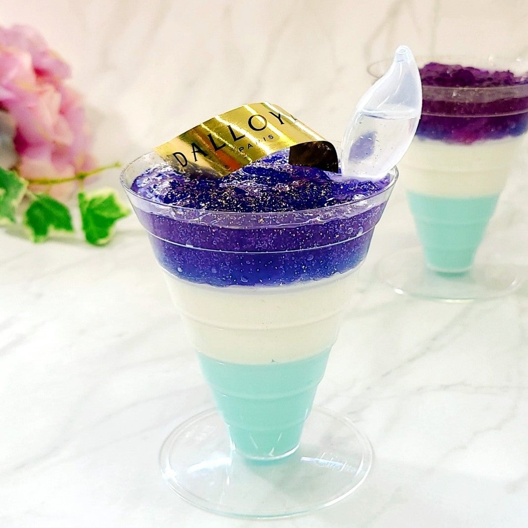 ココナッツ風味のパンナコッタに、シトロンクリームとシャンテリー、バタフライピーのクラッシュジュレを重ねました。スポイトに入ったクエン酸シロップをかけて混ぜると、ジュレが青から紫に変化します。
