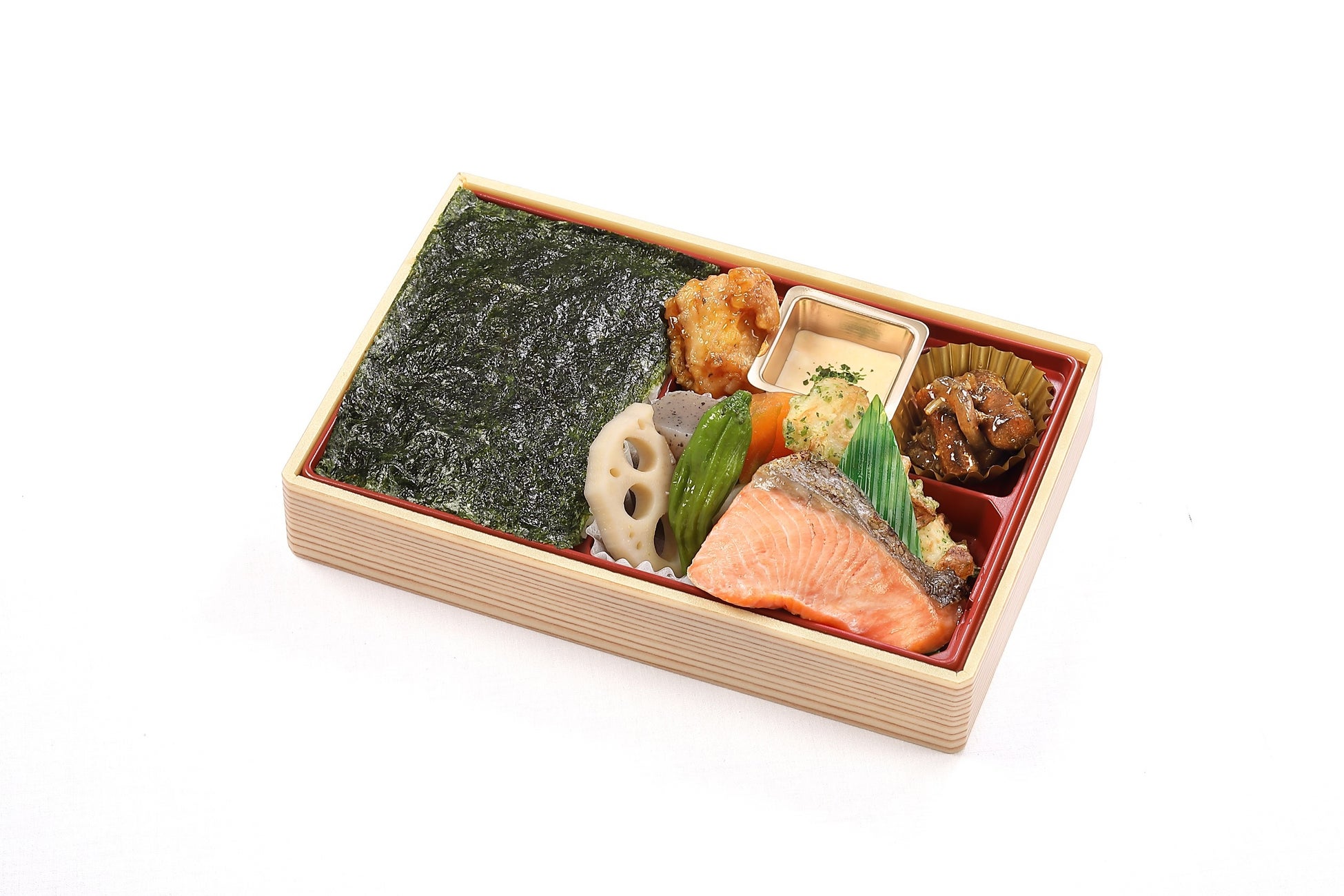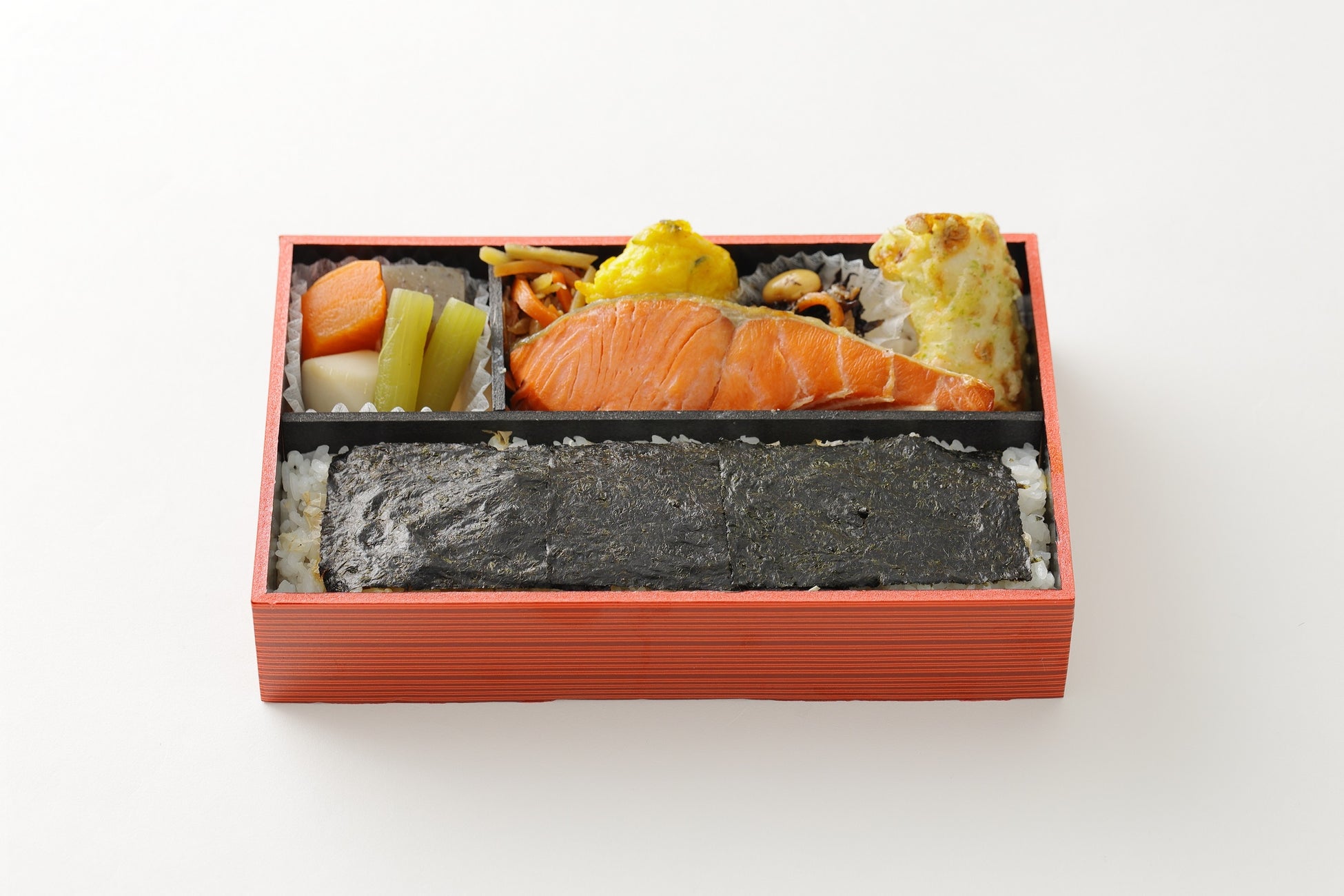 山形屋の海苔、にんべんの鰹節、味の浜藤のこだわりの紅鮭を使用した素材にこだわった海苔弁当です。