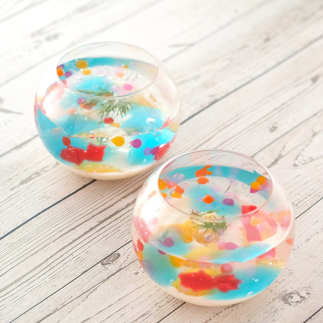 カラフルな水玉や金魚に見立てたお菓子を入れた夏のスイーツ。