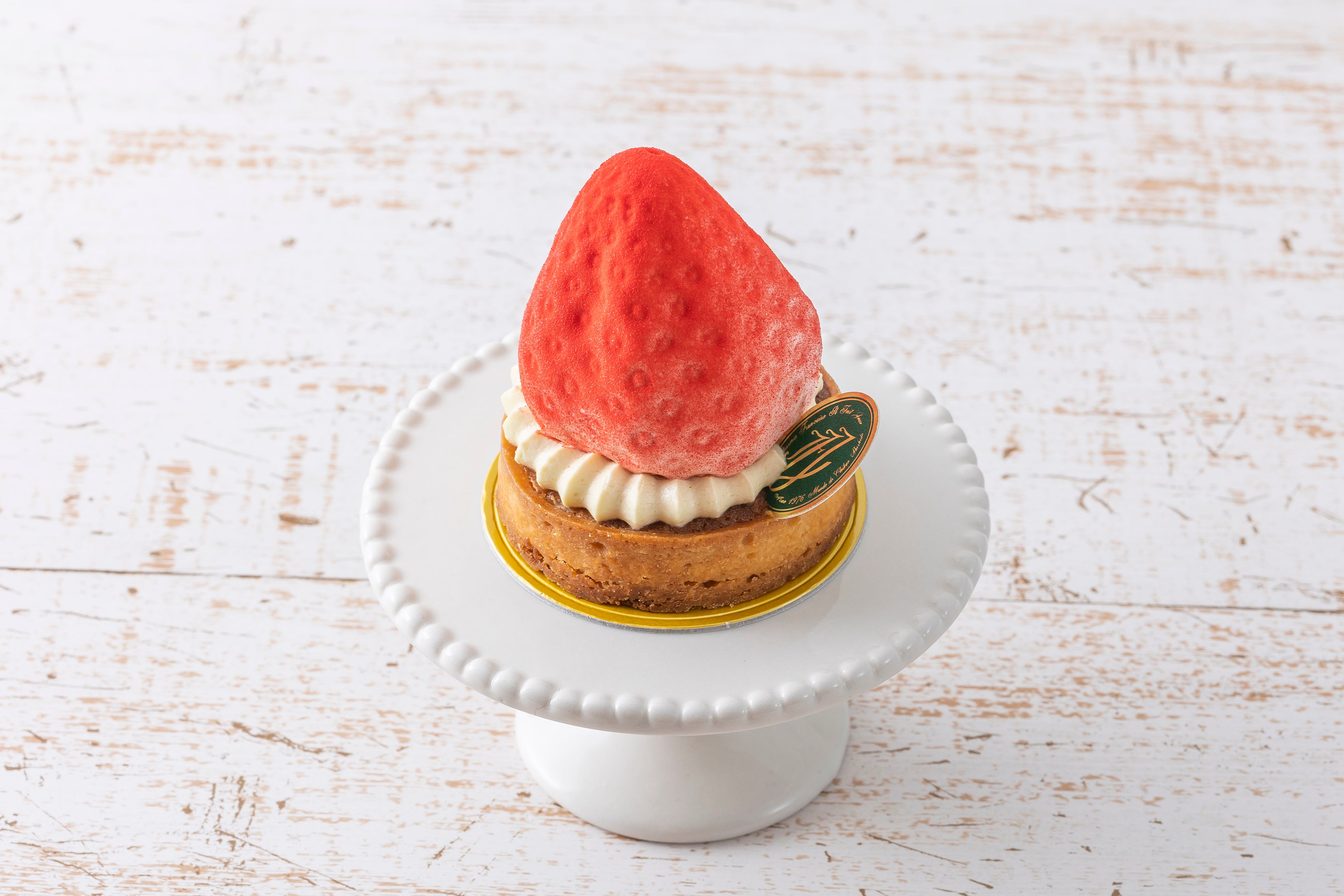 タルトの上にピスタチオクリームと大きないちご型のムースをのせました。いちごムースの中に野いちごのジュレを忍ばせています。