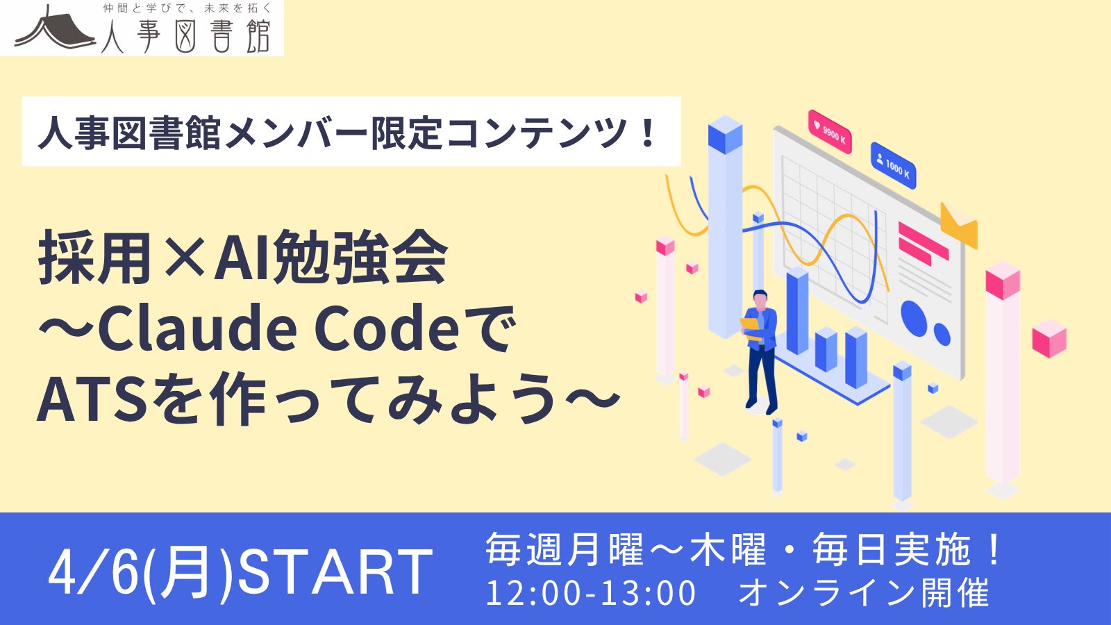 人事図書館メンバー限定「採用×AI勉強会」を4月6日より開始!Claude CodeでATSづくりから学ぶ、採用担当者のための継続実践プログラム