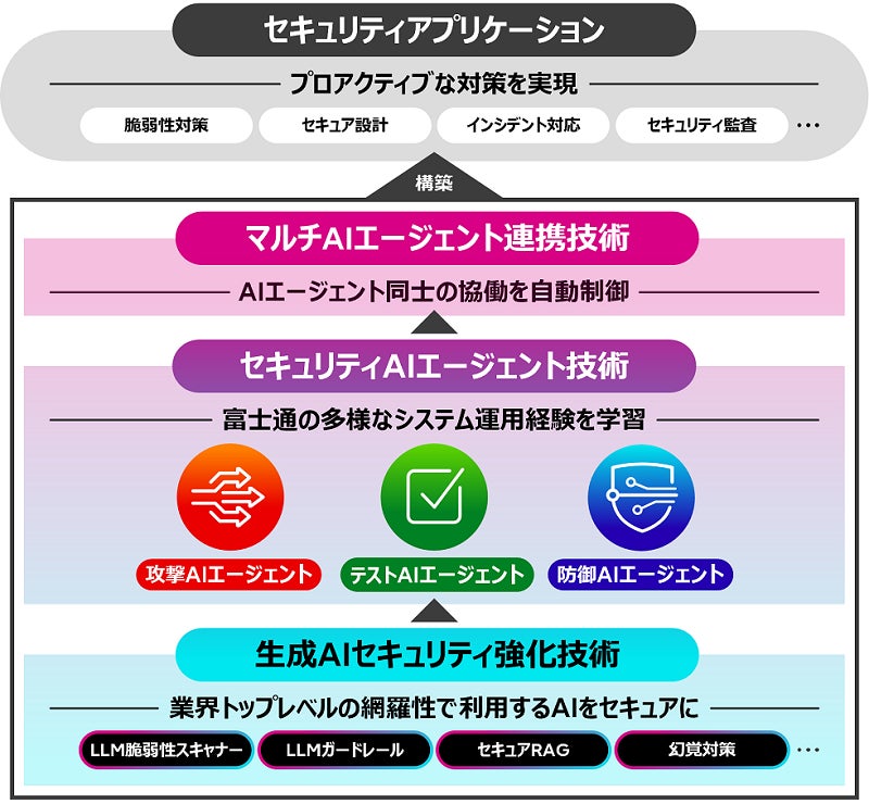 当社は、このほど、AIサービス「Fujitsu Kozuchi」のコア技術として、攻撃や防御などのセキュリティに特化したスキルやナレッジを持つ複数のAIエージェントを連携させることで、企業や公共団体のITシステムにおいて、脆弱性を悪用する攻撃や生成AIへの攻撃といった新たな脅威へのプロアクティブなセキュリティ対策を支援するマルチAIエージェントセキュリティ技術を開発しました。