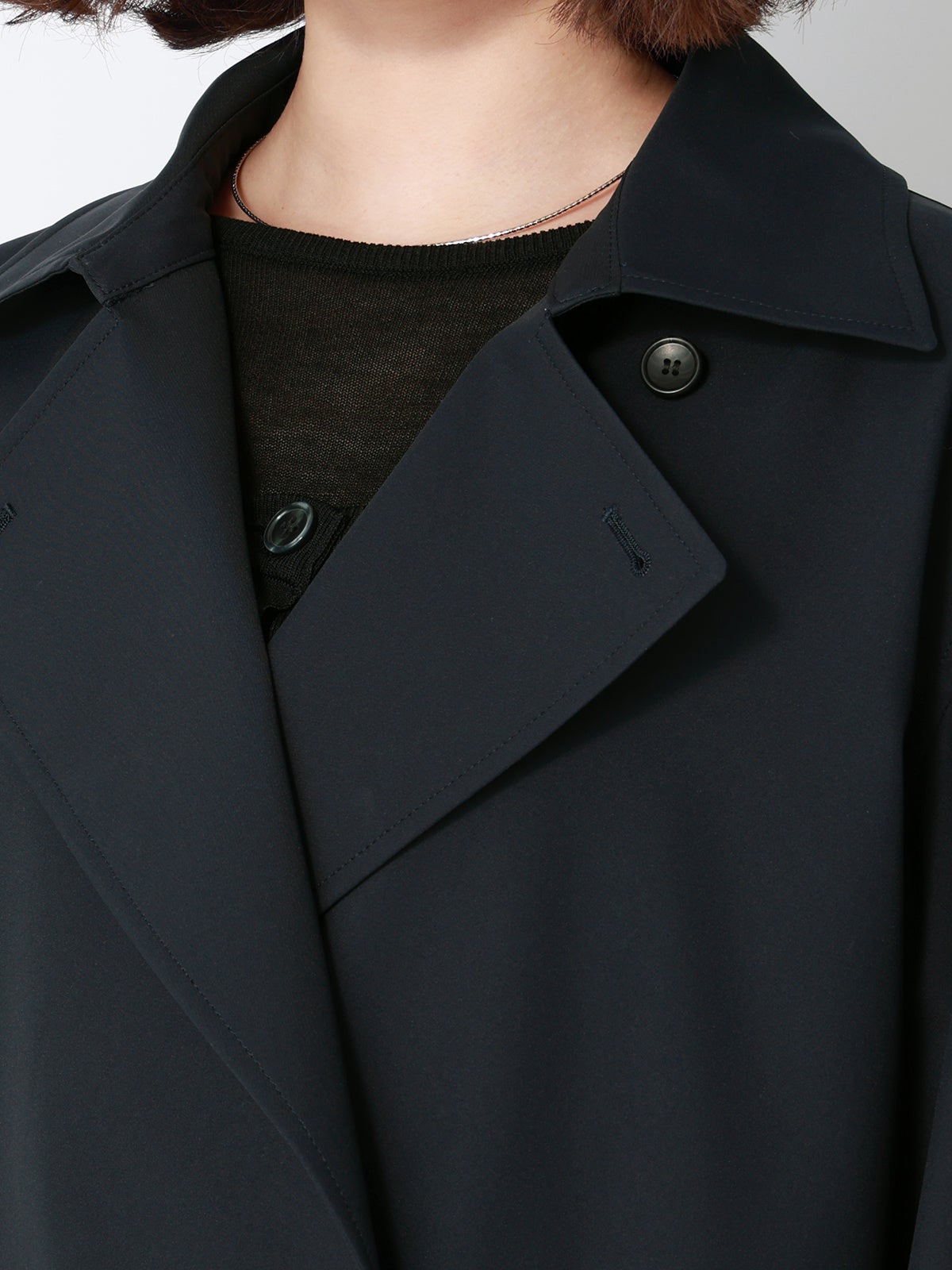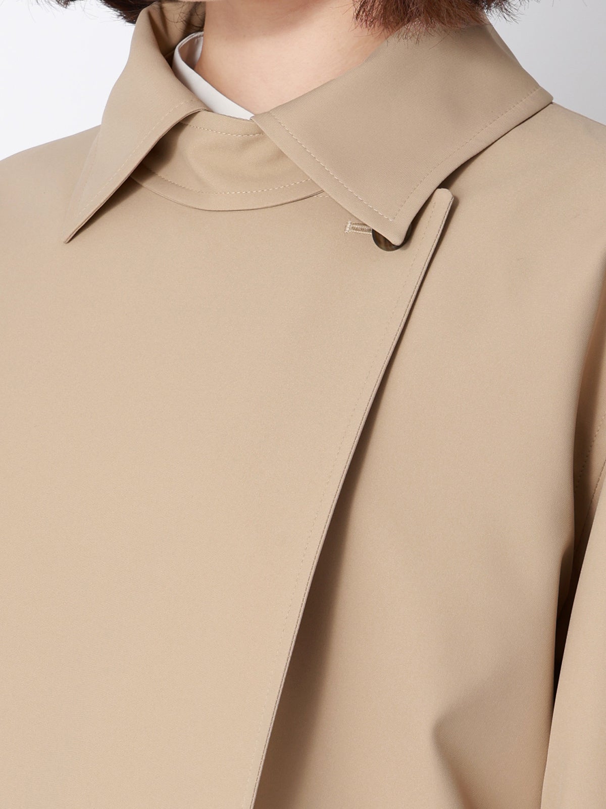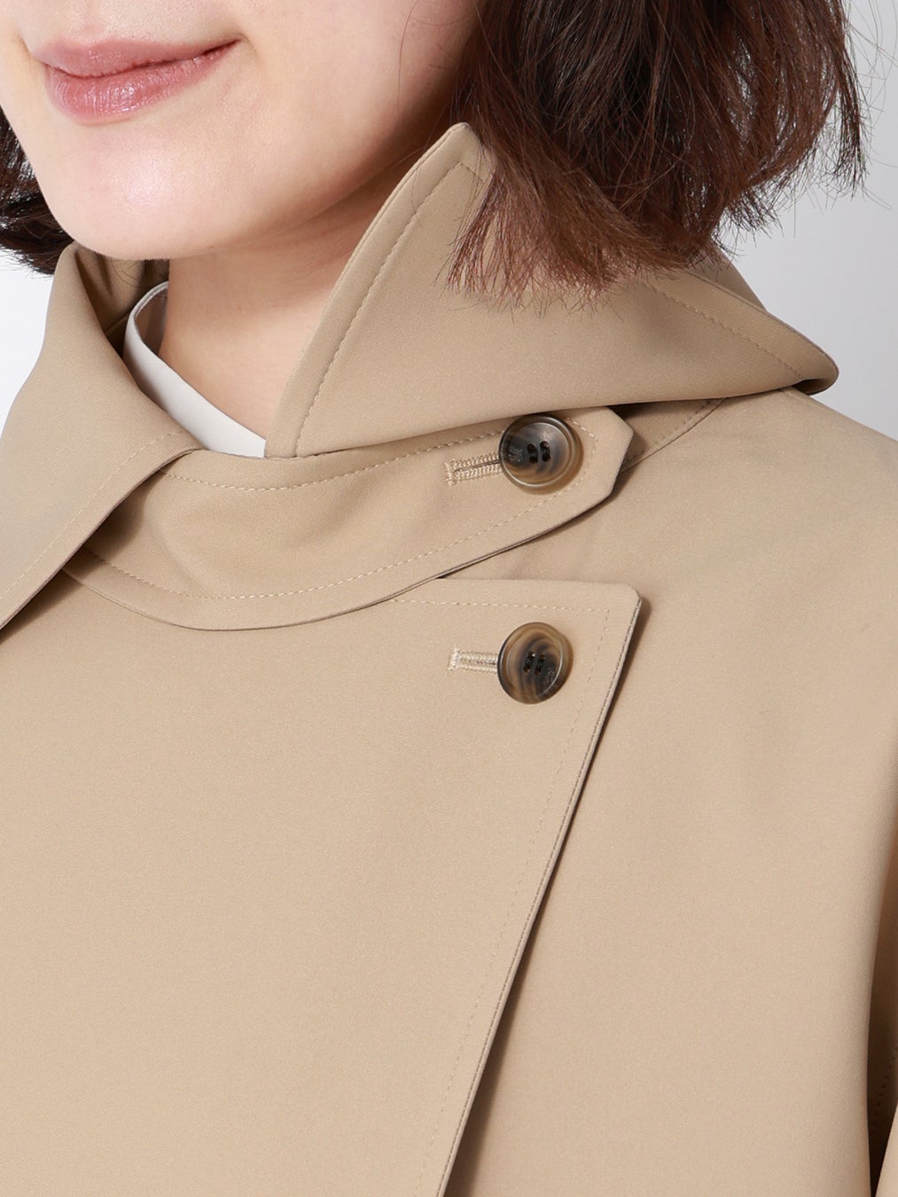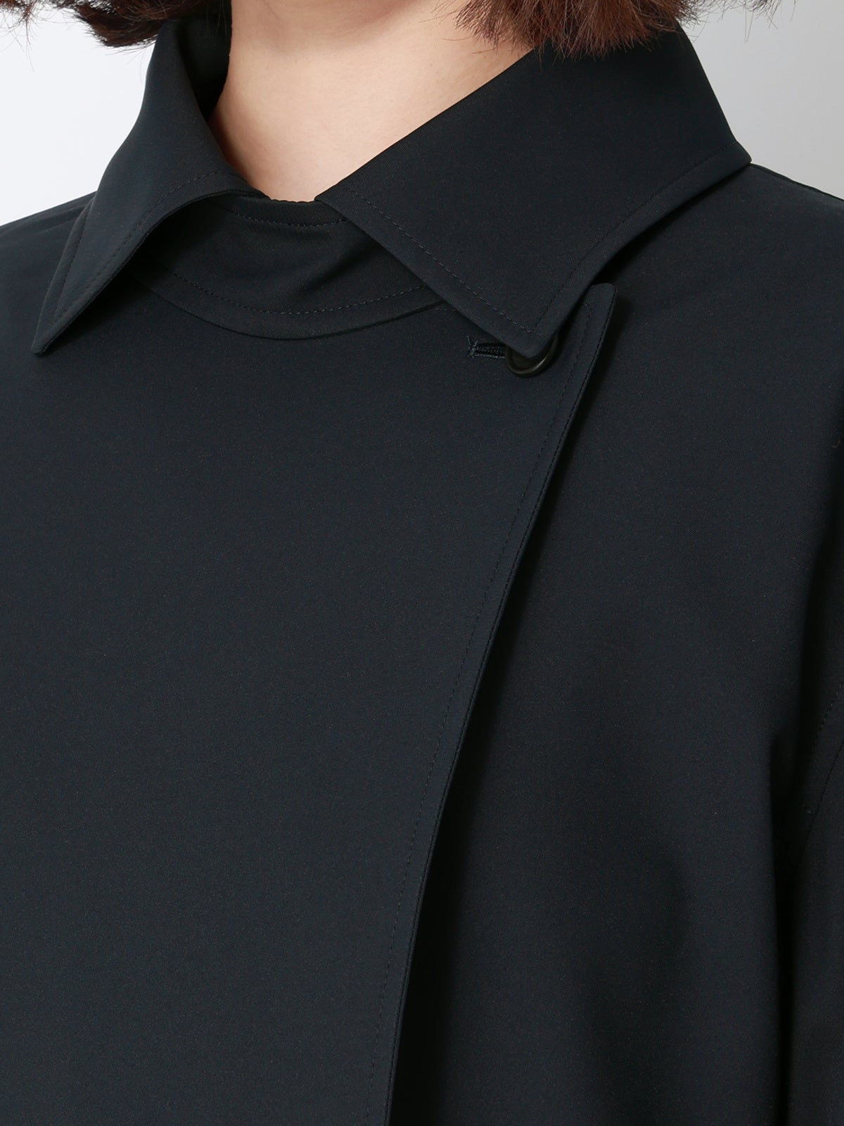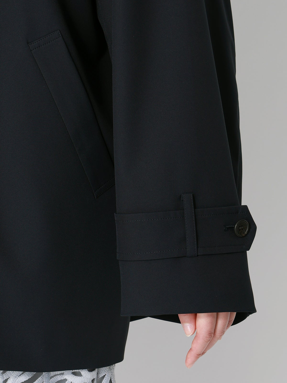 素材には、シワになりにくいポリエステルを採用。特有の光沢を抑え、天然素材ならではの風合いを演出する特殊な糸を使用することで、コットンのような柔らかな肌触りを実現しました。これにより、フロントボタンを閉じて襟を立たせたスタイルでも首当たりが優しく、快適に着用できます。デザインは、裾にかけて程よく広がるシルエットで、ジャケットの上から着用しても肩まわりがごわつかないようアームホールにゆとりを持たせています。スーツにも合わせやすくビジネスでも使いやすいデザインにしているためマルチに活躍するコートです。
