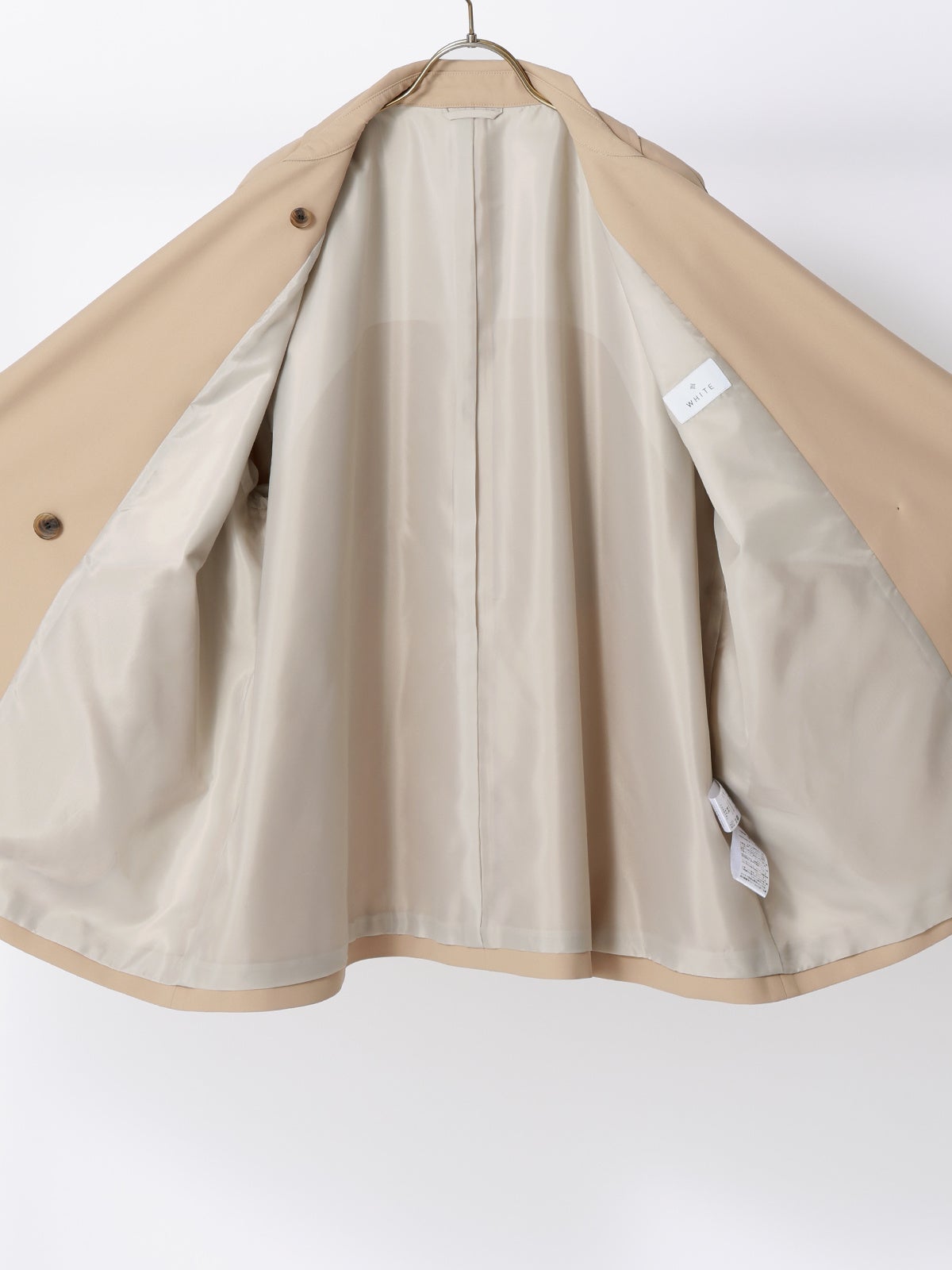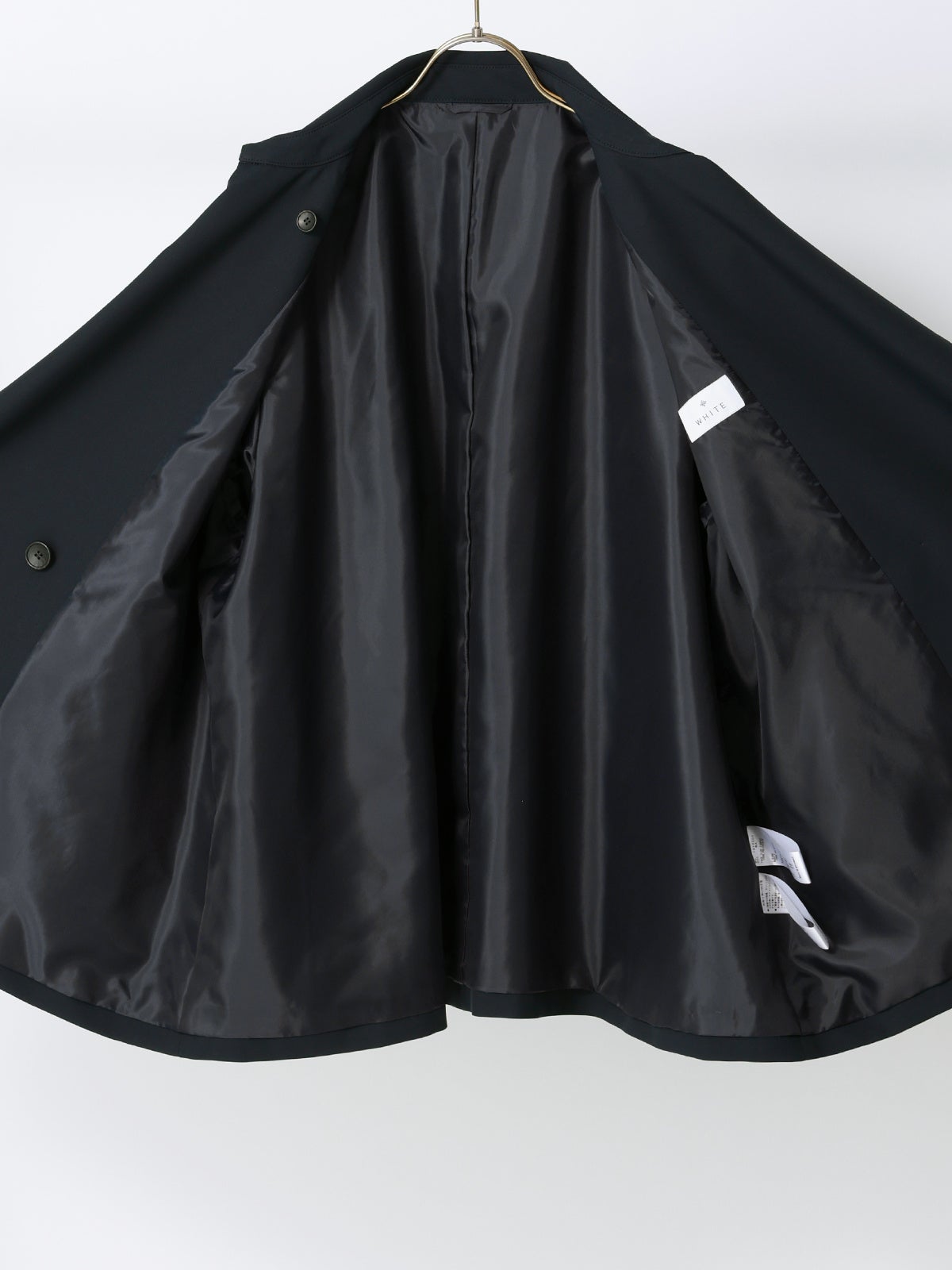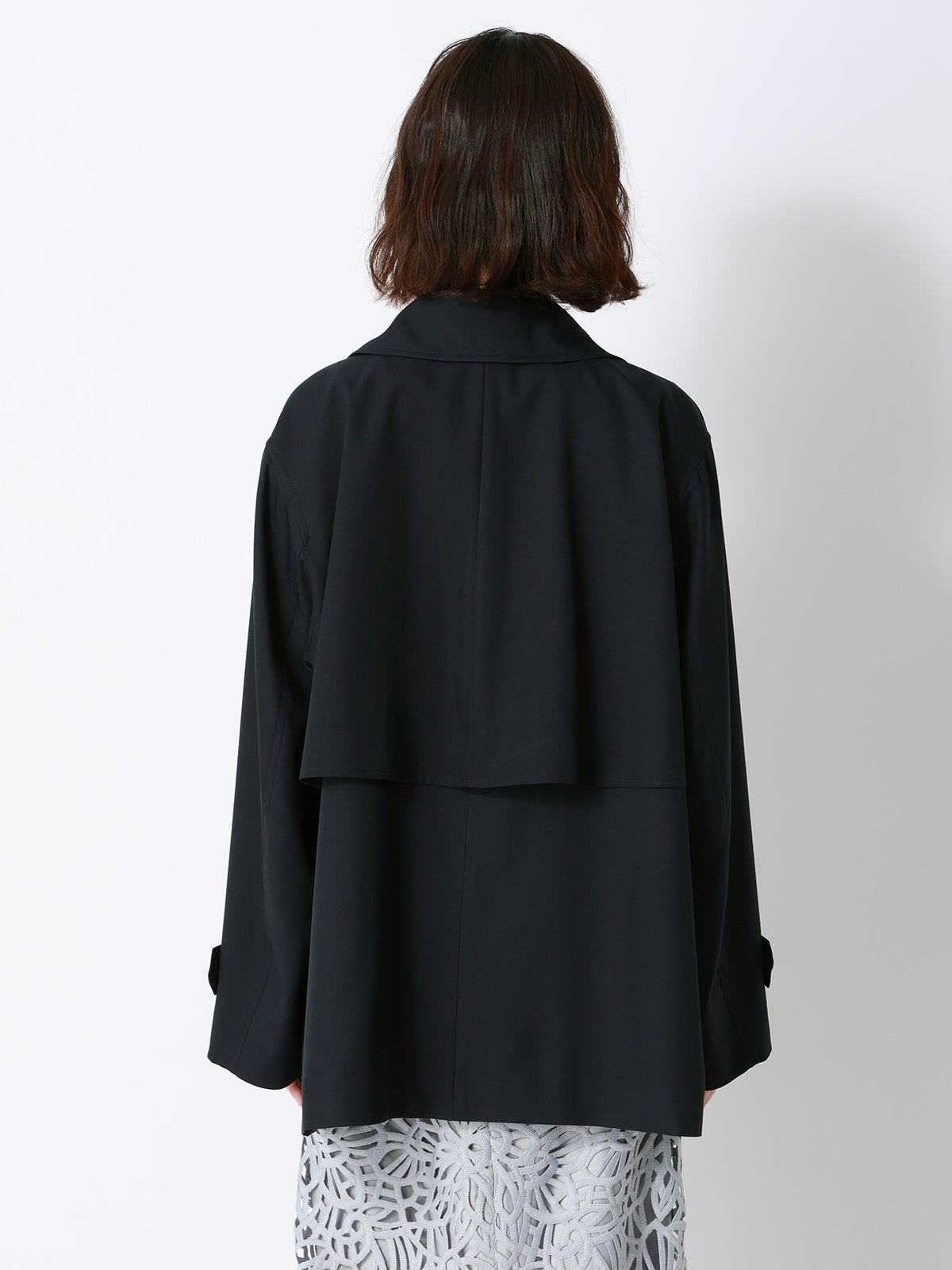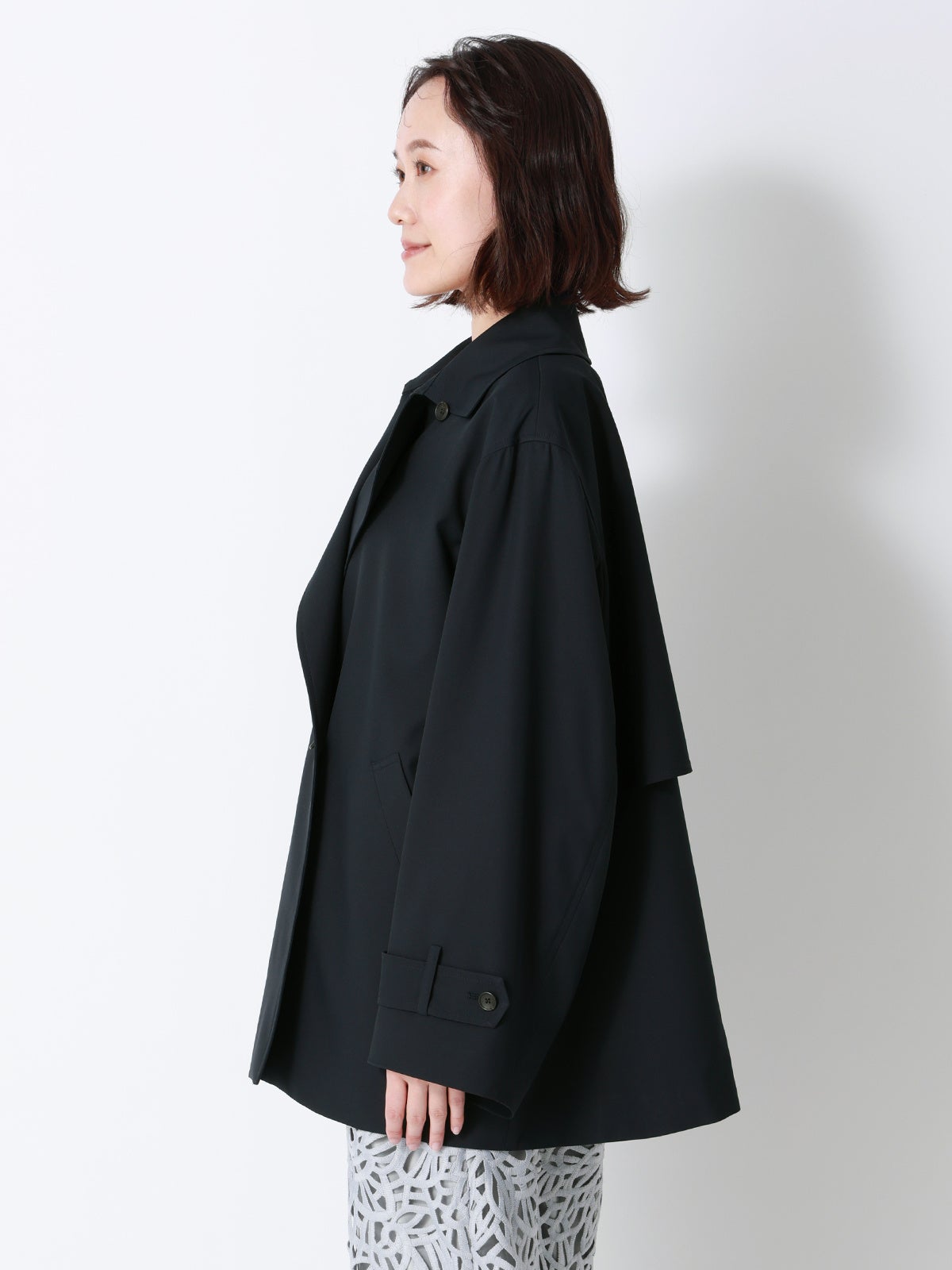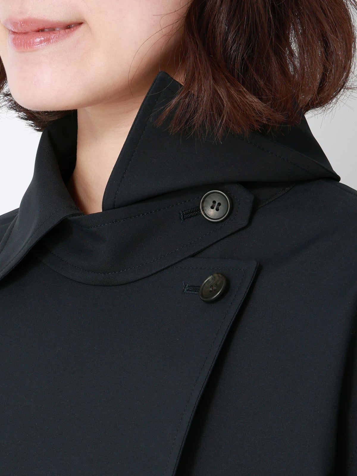 素材には、シワになりにくいポリエステルを採用。特有の光沢を抑え、天然素材ならではの風合いを演出する特殊な糸を使用することで、コットンのような柔らかな肌触りを実現しました。これにより、フロントボタンを閉じて襟を立たせたスタイルでも首当たりが優しく、快適に着用できます。デザインは、裾にかけて程よく広がるシルエットで、ジャケットの上から着用しても肩まわりがごわつかないようアームホールにゆとりを持たせています。スーツにも合わせやすくビジネスでも使いやすいデザインにしているためマルチに活躍するコートです。