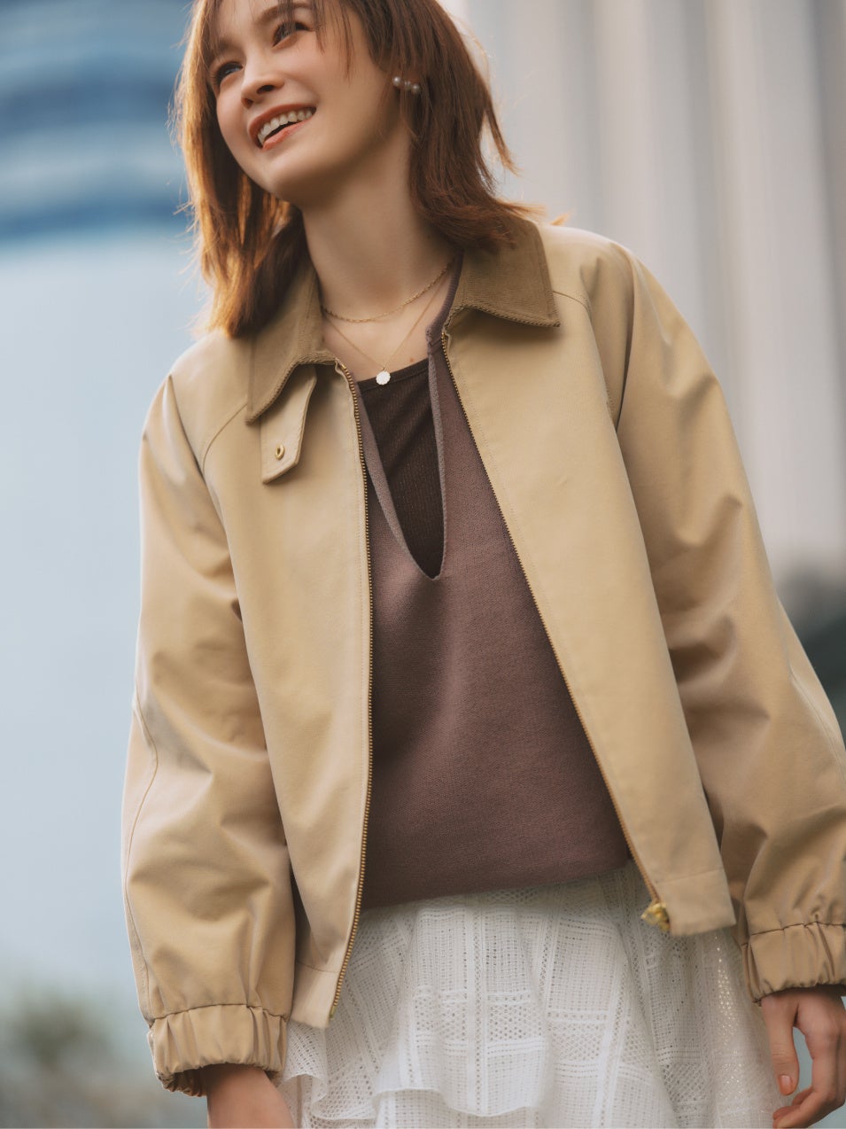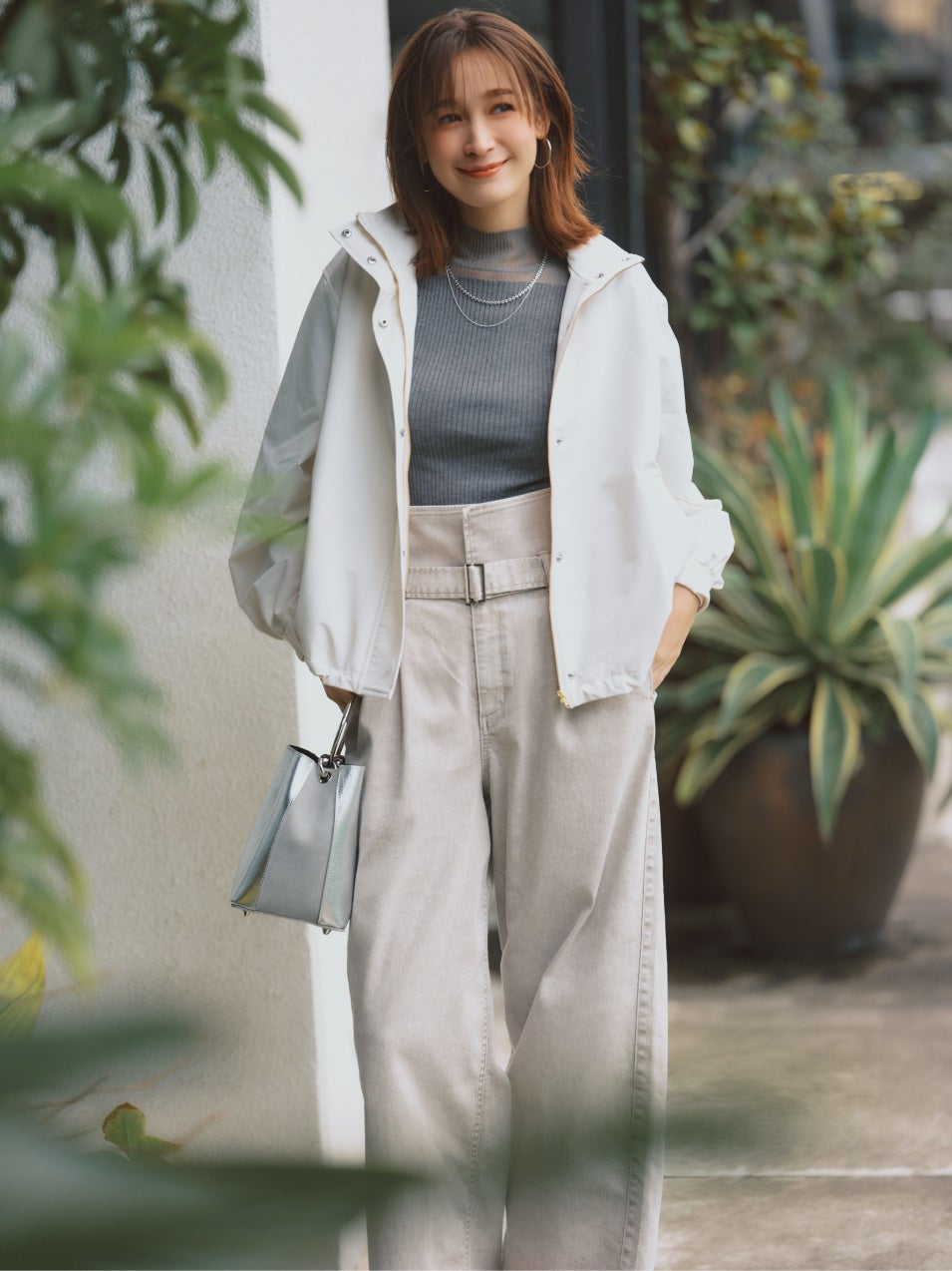 BLOUSON \26,400 / KNIT \15,400 / PANTS \20,900 / NECKLACE \6,380 / BAG \19,800