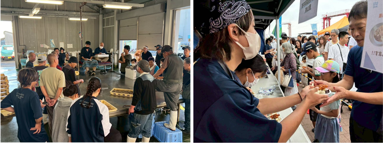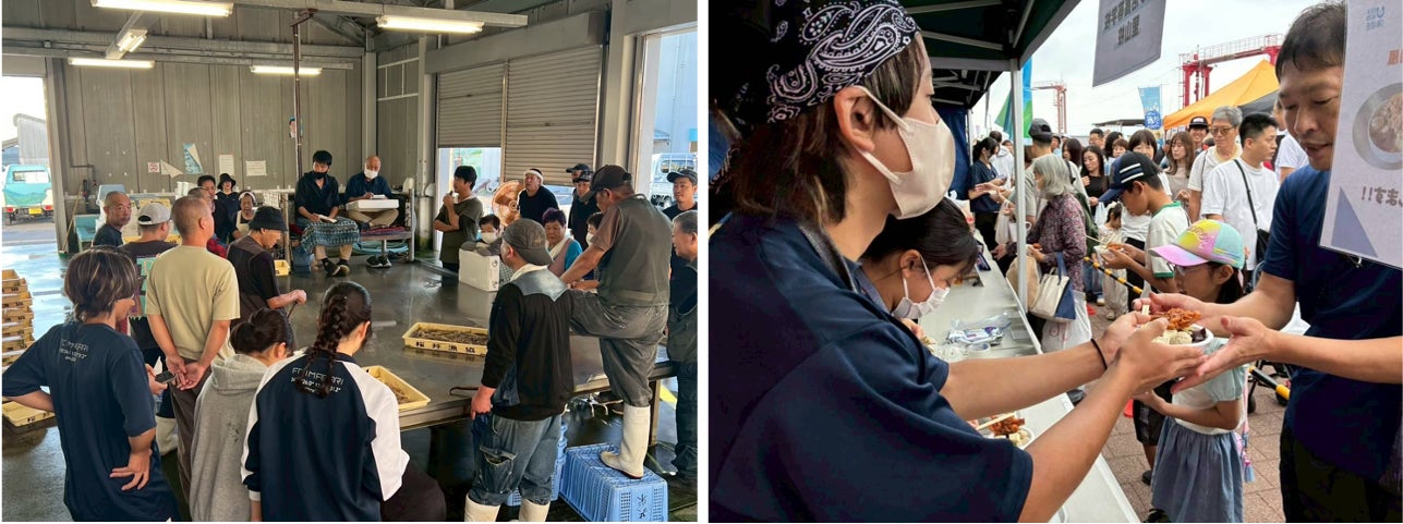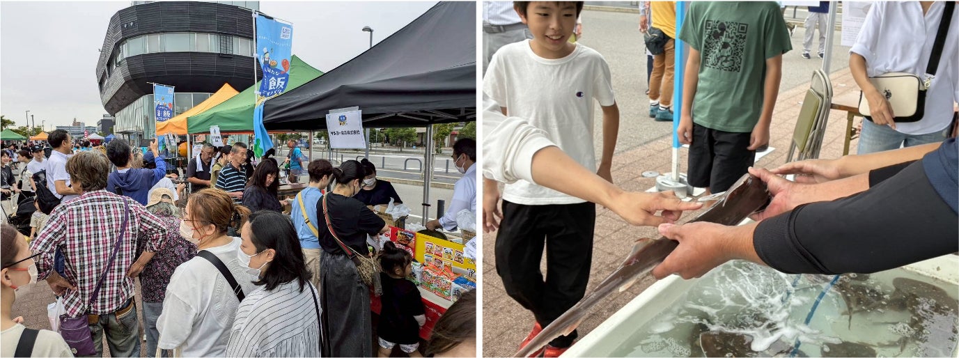 このうち、(株)古屋野水産・ 壽司きんぼしのブースでは、内臓に独特の臭いがあり、毒のあるトゲを持つことから敬遠されがちな「アイゴ」を、お酢でしめた押し寿司やフライにして販売。また、今治市農林水産課のブースには低利用魚やエイ、サメの仲間に直接触れられるタッチングプールを設置。子どもから大人まで幅広い世代が楽しみながら学べる内容となり、海の恵みと地域の食文化の魅力を再発見する機会となりました。