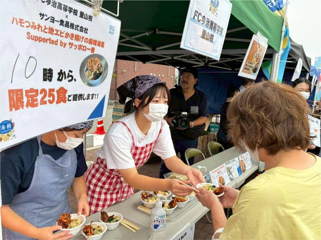 春雨と麺を組み合わせた際にスープが吸われてしまうなどの課題もありましたが、サンヨー食品担当者からのアドバイスをもとに改良を重ね、完成度を高めました。そして10月12日、お披露目の機会となった「せとうちみなとマルシェ」内で125食限定の試食提供を実施。来場者からは「新しい味で美味しい」「ハモがこんなに食べやすいとは思わなかった」など好評をいただきました。試食を通して、今治の海の現状を知ってほしい、そして“美味しいのに出回っていない魚”をもっと食べてほしいという高校生たちの熱い思いが、多くの来場者に伝わったイベントとなりました。
