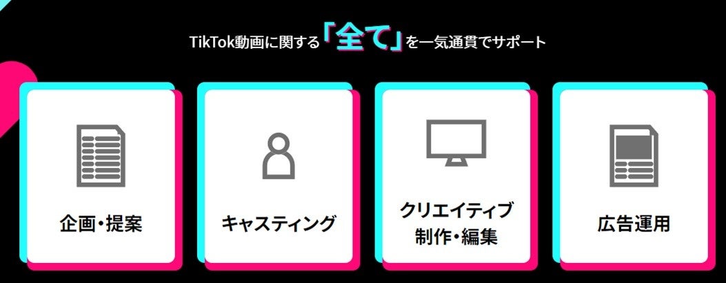 ・必要に応じて、TikTok内インフルエンサーのキャスティングや、TikTok内プロモ―ト(インフルエンサーに商品サービスをご紹介)も実施いたします。