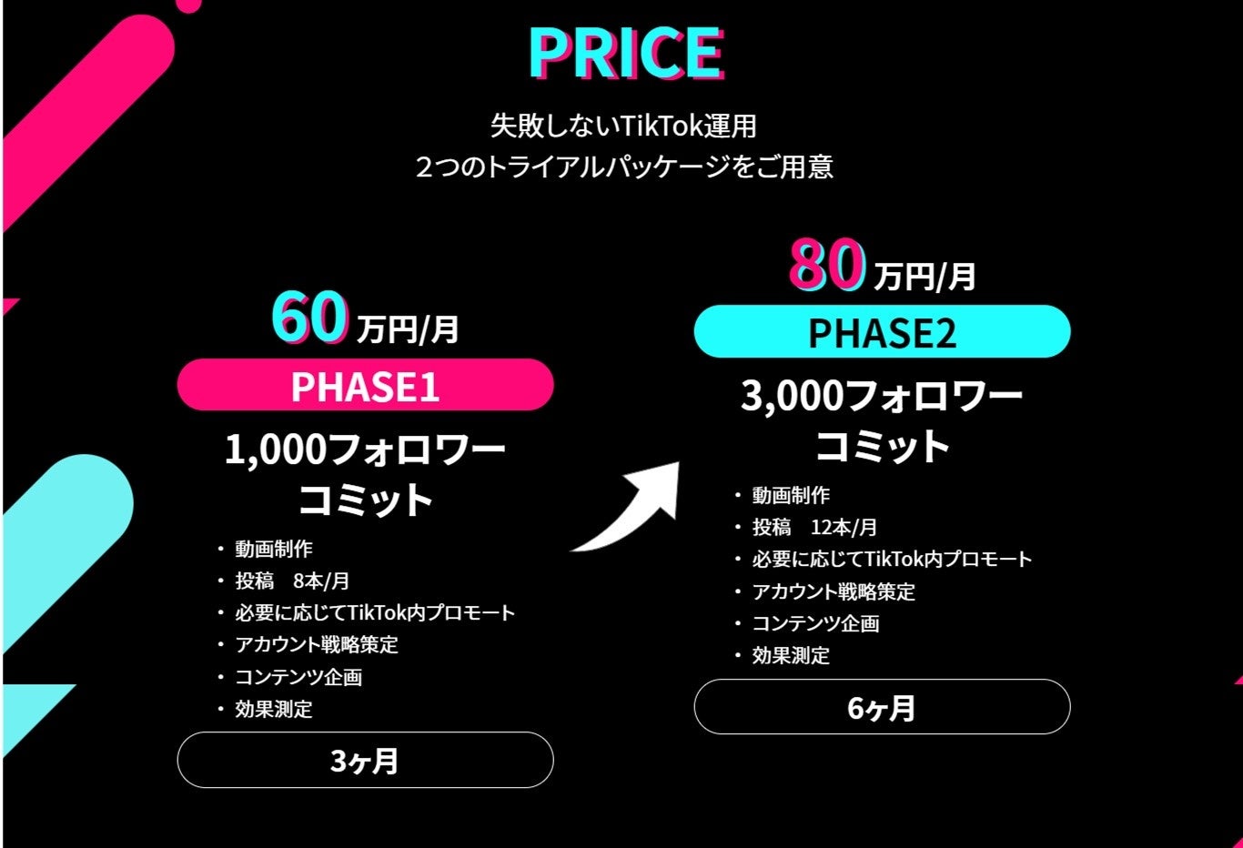 「縦型動画Works」では、初めてTikTok運用を行う方も、これまでTikTok運用をしていたものの、あまり効果を感じられていないという方も、安心してまるごとお任せいただけるパッケージプランです。コンテンツの企画だけでなく、動画制作・投稿、必要に応じTikTok内プロモート・効果測定までを、フォロワー数や動画再生数にコミットしながら、トータルでサポートします。