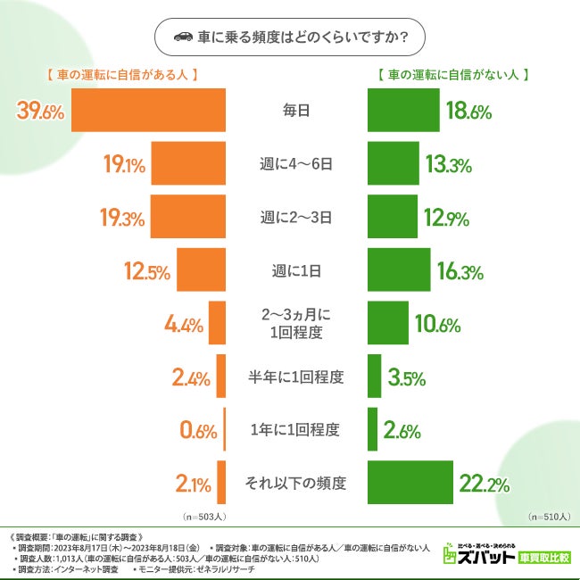 ・アンケート回答者(1,013人)のうち、車の運転に自信がある人(503人)の運転頻度は「毎日乗っている」が39.6%、車の運転に自信がない人(510人)は「1年に1回以下」が22.2%と最も多い回答結果に。