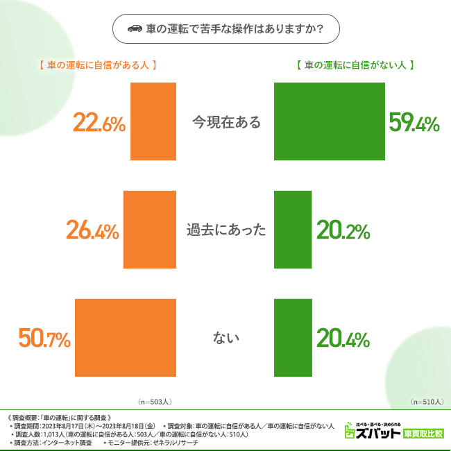 一方で、車の運転に自信がない人の回答を見てみると、苦手な運転操作が『今現在ある(59.4%)』『過去にあった(20.2%)』『ない(20.4%)』という割合になりました。