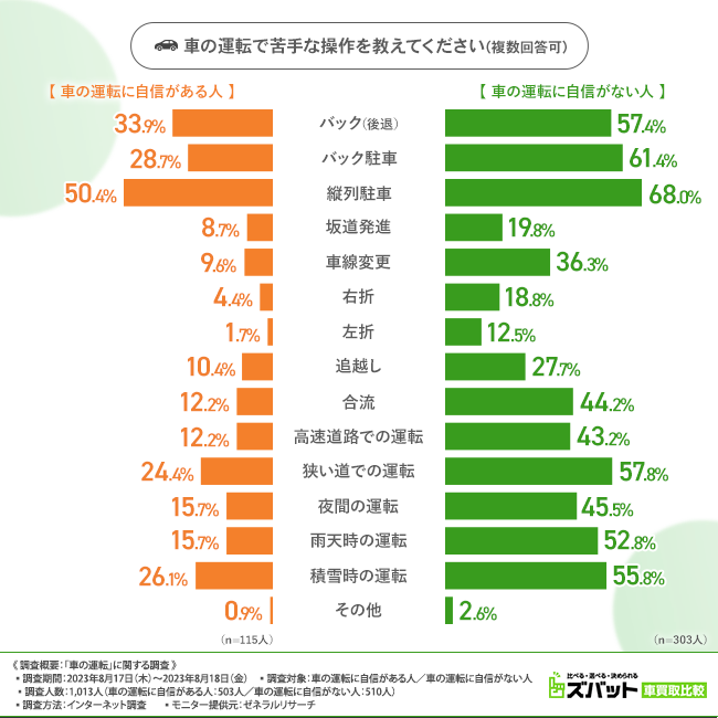 次に、車の運転に自信がない303人の結果を見てみると、『縦列駐車(68.0%:206人)』と回答した人が最も多く、次いで『バック駐車(61.4%:186人)』『狭い道での運転(57.8%:175人)』が続きました。