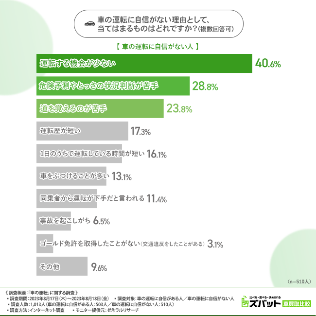 ・車の運転に自信がないと答えた510人のうち、運転に自信がない理由として、「運転する機会が少ない」「危険予測・状況判断が苦手」「道を覚えるのが苦手」などが上位を占めた。