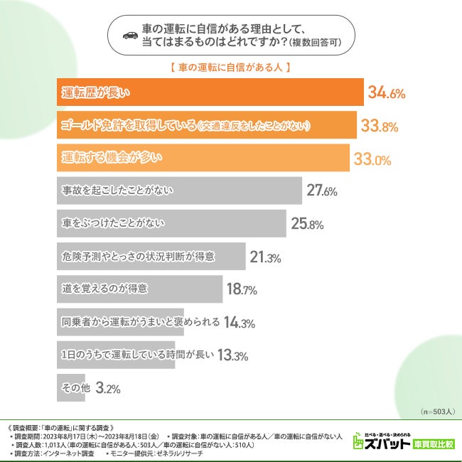 ・車の運転に自信があると答えた503人のうち、運転に自信がある理由として、「運転歴が長いこと」「ゴールド免許を取得」「運転する機会が多い」といった回答が上位に挙がった。