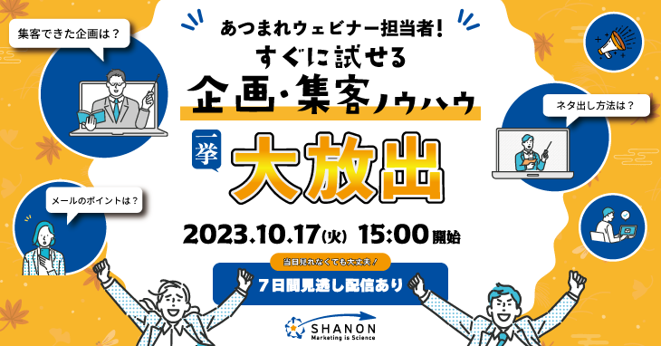株式会社シャノン(本社:東京都港区、代表取締役社長:中村 健一郎)は、これまで100回以上のウェビナー企画を手がけてきた実務担当者から、企画方法や効果のあった集客施策についてノウハウを一挙ご紹介するウェビナーを10月17日(火)に開催します。