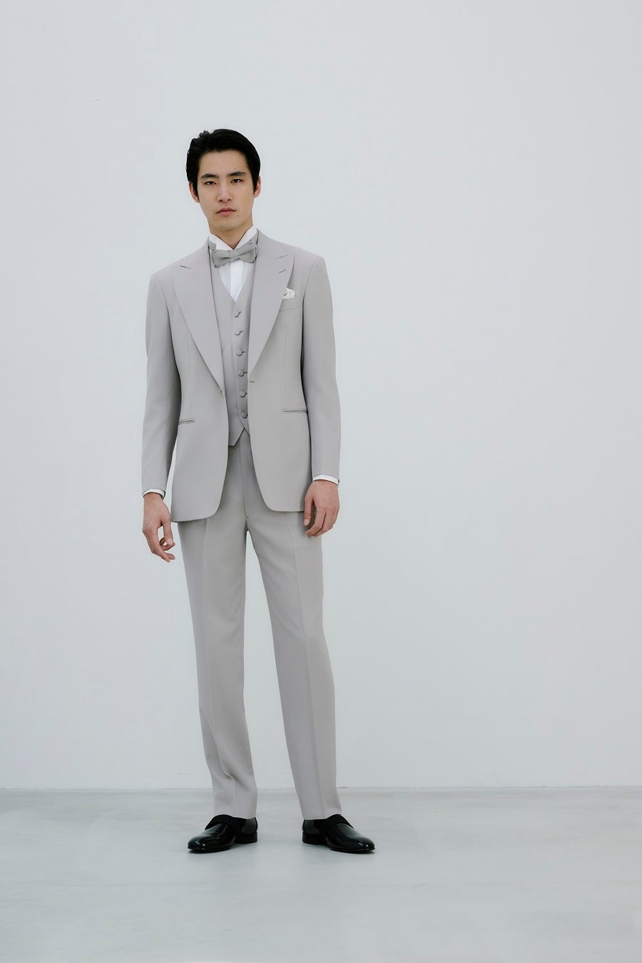 イタリアの名門生地メーカーVITALE BARBERIS CANONICO(ヴィターレ・バルべリス・カノニコ)の上質なウール生地を使用した、洗練されたフォーマルタキシード。柔らかな肌触りと美しい発色が特徴で、上品なグレーカラーがエレガントな雰囲気を演出します。デザインはショールカラーがクラシックな印象を与え、胸元がややラウンドした4ツボタンベストが洗練されたアクセントに。格式のあるフォーマルシーンにふさわしい、気品あふれる一着です。