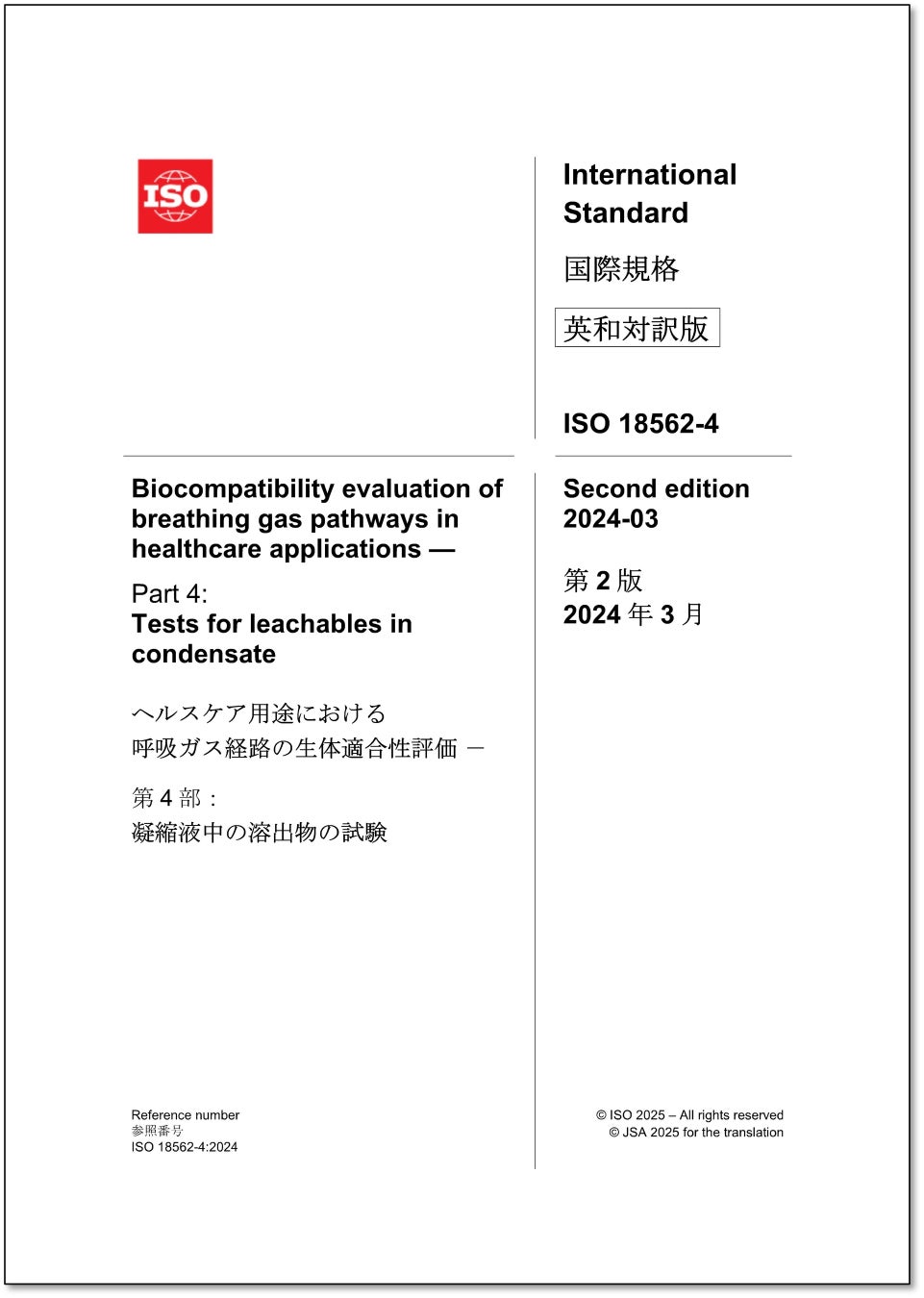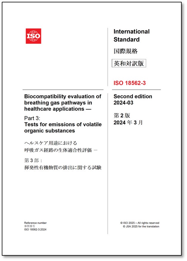 一般財団法人日本規格協会(本部:東京都港区、理事長:朝日弘)は、2025年4月1日(火)に「ISO 18562-3:2024 ヘルスケア用途における呼吸ガス経路の生体適合性評価-第3部:揮発性有機化合物の排出試験」と「ISO 18562-4:2024 ヘルスケア用途における呼吸ガス経路の生体適合性評価-第4部:凝縮液中の溶出物の試験」の邦訳(英・日対訳版)を発行いたしました。