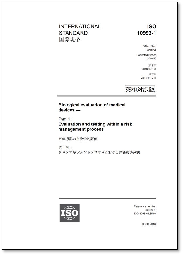 ISO 10993-1:2018 医療機器の生物学的評価-第1部:リスクマネジメントプロセスにおける評価及び試験 Biological evaluation of medical devices -- Part 1: Evaluation and testing within a risk management process