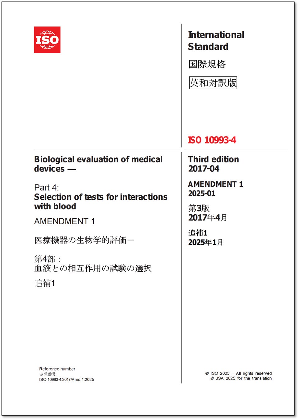 ISO 10993-4:2017/Amd 1:2025 追補1-医療機器の生物学的評価-第4部:血液との相互作用の試験の選択Biological evaluation of medical devices -- Part 4: Selection of tests for interactions with blood -- Amendment 1