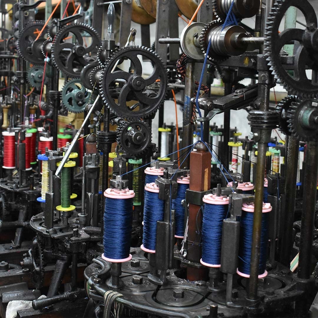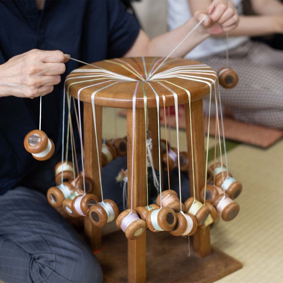 手作業で1本1本の紐を組む伝統的な「手組」、そして「製紐機(せいちゅうき)」と呼ばれる機械製法にて、現在もくみひも製造が続いています。