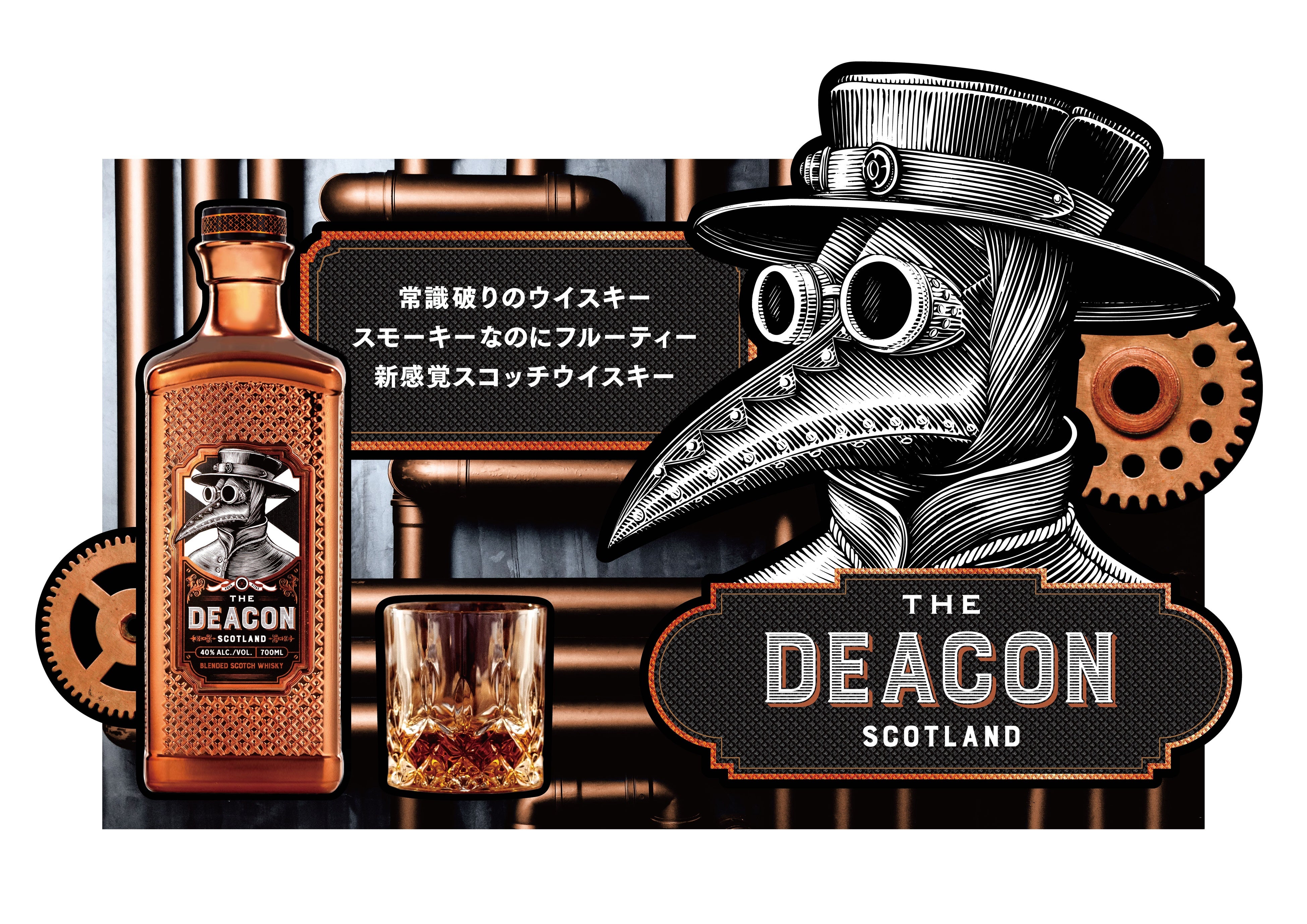 「ザ・ディーコン」は、伝統やカテゴリー、熟成年数といったウイスキーの既成概念を解き放ち、新たな味わいを追求した商品です。スコッチウイスキーはスコットランドの地方それぞれの風土が味わいの個性を形づくり、中でも名高い生産地がアイラ島とスペイサイド地方です。「ザ・ディーコン」は、そのアイラ島とスペイサイドのモルトウイスキーを含む、厳選されたウイスキーをブレンドし、アイラモルトの特徴的なピートスモークの風味に、スペイサイドモルトの焚火のようなスモーキーさが加わり、スモーキーさとフルーティーさを併せ持つ、複雑でリッチな味わいに仕上げています。