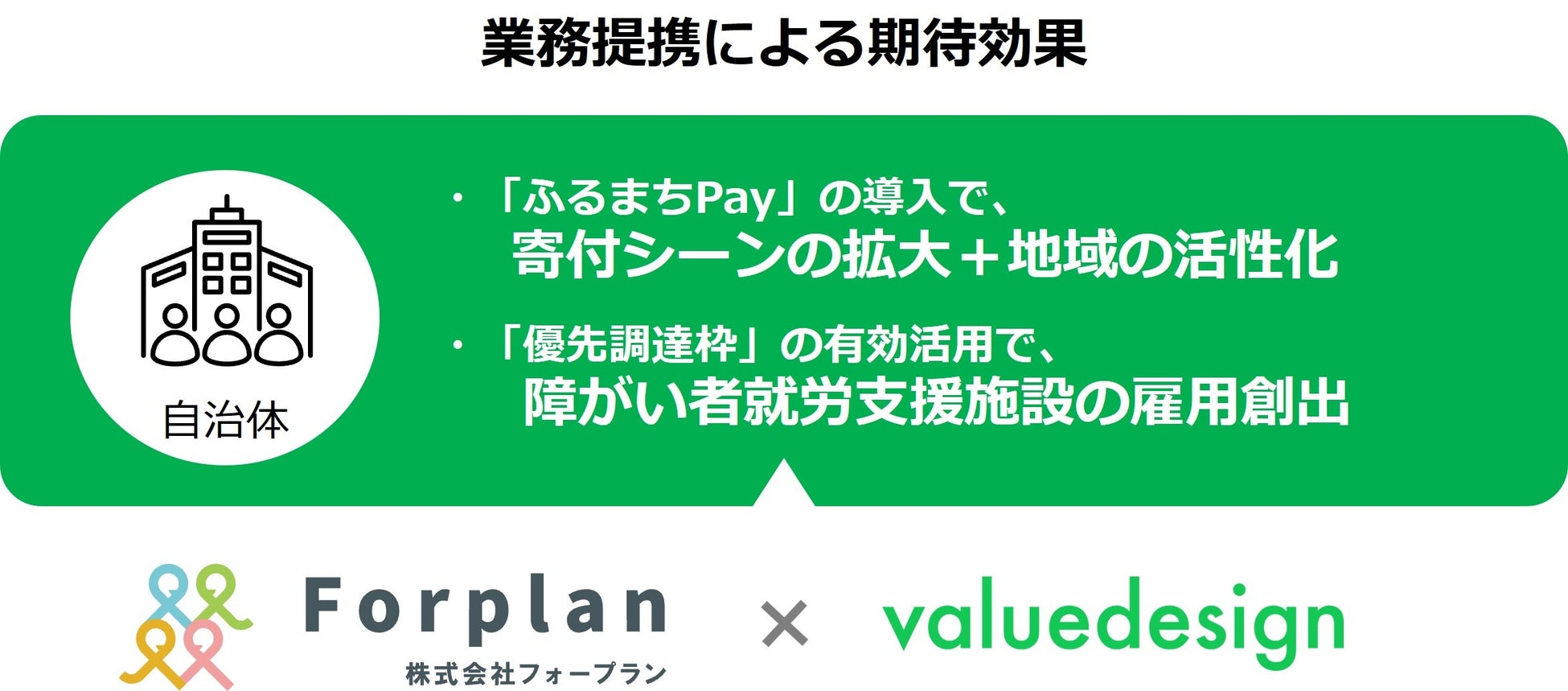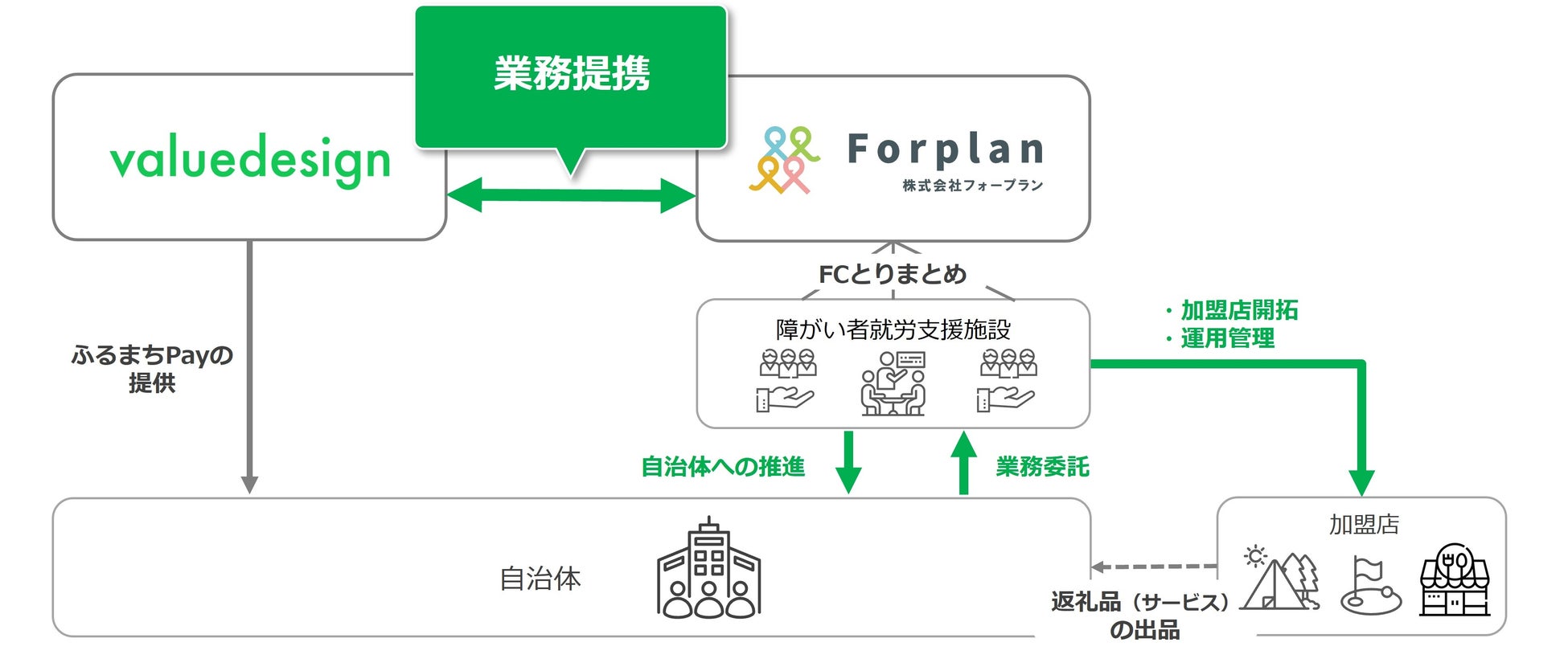 障がい者就労支援施設をフランチャイズ展開する株式会社フォープラン(本社:愛知県名古屋市、代表取締役社長:内田 直希、以下「フォープラン」)、ペイクラウドホールディングス株式会社(東証グロース:4015)の傘下でキャッシュレスサービス事業を展開する株式会社バリューデザイン(本社:東京都中央区、代表取締役社長:林 秀治、以下「バリューデザイン」)は、バリューデザインが提供する現地決済型ふるさと納税サービス「ふるまちPay」の全国の自治体へのさらなる拡販と、障がい者の雇用創出の促進を目指し業務提携することをお知らせします。