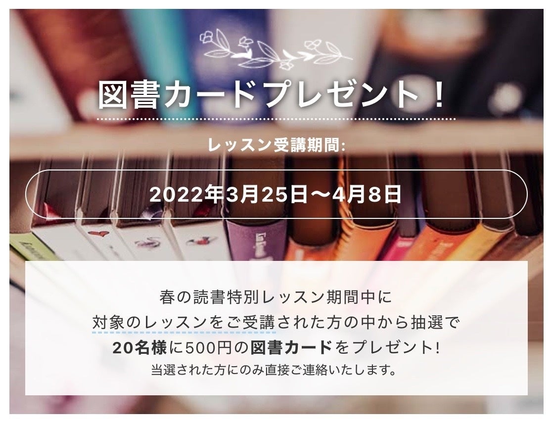 2022年3月25日〜4月8日の期間中に、特設ページに記載がある限定レッスンを受講した方から抽選で20名様に500円分の図書カードNEXTをプレゼントいたします。