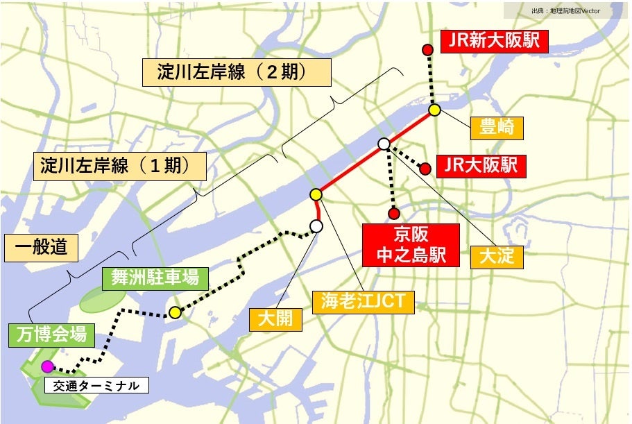 淀川左岸線(2期)豊崎入口~阪神高速2号淀川左岸線大開IC付近 |