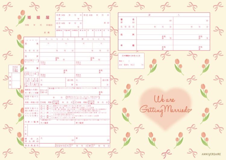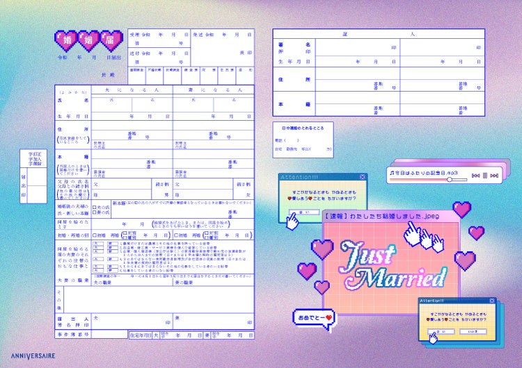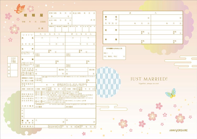 ゲストハウスウェディングを中心に、様々な記念日プロデュース事業を展開するアニヴェルセル株式会社は、「婚姻届のデザインにこだわりたい」「おしゃれな婚姻届がほしい」という方に好評の【アニヴェルセルオリジナル婚姻届】に新デザイン4種を追加いたします。新たに登場するデザインは、蝶がモチーフの和柄、スイートピー、チューリップとリボン、Y2K(*)のデジタル調のデザインなど、春をテーマにした婚姻届です。
