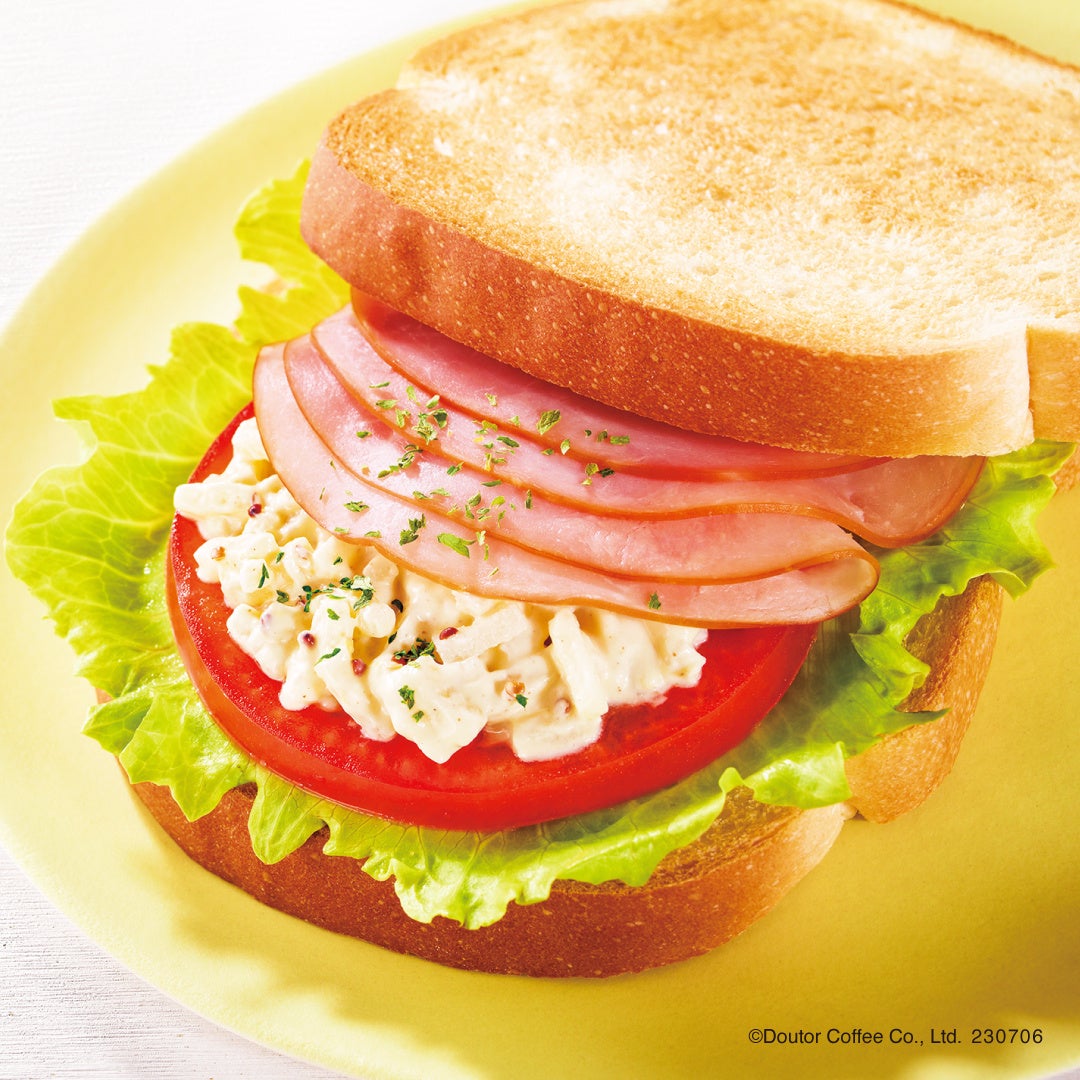 モーニング・セットAがリニューアル。ハム、ディジョンマスタード入りのポテトサラダにトマト、レタスを重ねたサンドイッチです。ピリッと辛く、シャキシャキ食感のポテトがアクセントになっています。