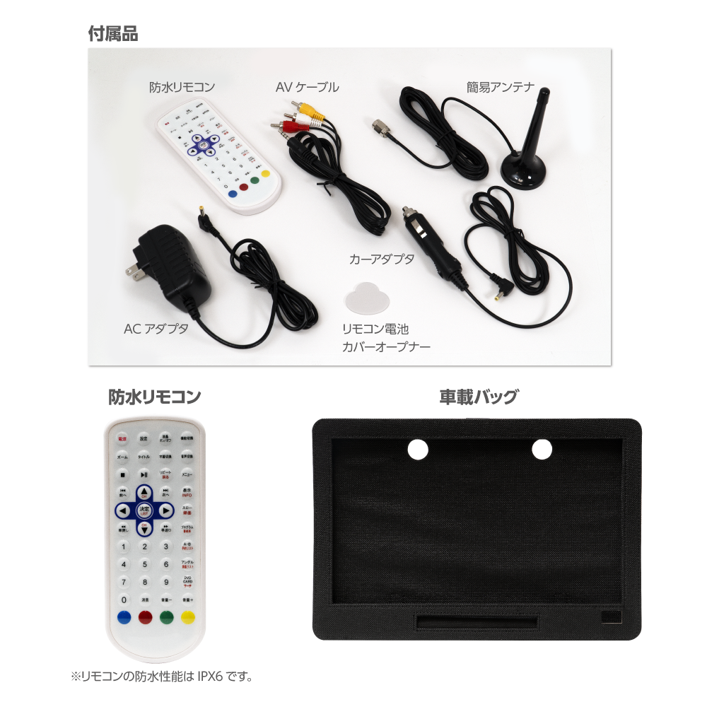 付属品:ACアダプタ (長約1.5m)、 AVケーブル (長約1.2m)、 車載用DCアダプタ (長約1.5m)、 車載用バッグ、取扱説明書、保証書、 B-CASカード、リモコン(動作テスト用電池付き CR2025)、 リモコン電池カバーオープナー