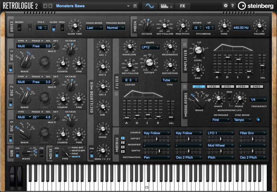 クラシックなアナログシンセサイザーの温かく太い音色を再現するRetrologue は、3基のオシレーターと一連のフィルターで、生々しいアナログリードやベース、はかなくデリケートなパッドやストラクチャー、攻撃的なコンピングパターンなど豊かで感性を触発する音色を生み出します。
