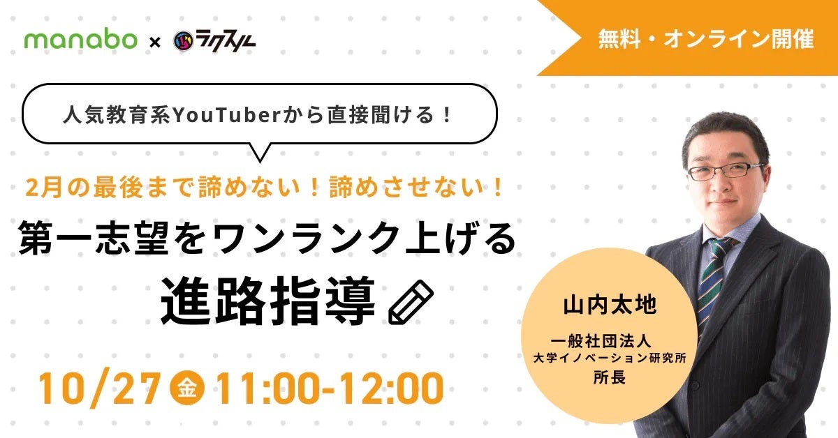今回2023年10月27日(金)に株式会社manabo様とともに、学校経営コンサルタントであり教育YouTuberでもある山内太地様をお迎えし、最新の大学入試情報や志望校をワンランク上げるための指導などをお話しいただきます。