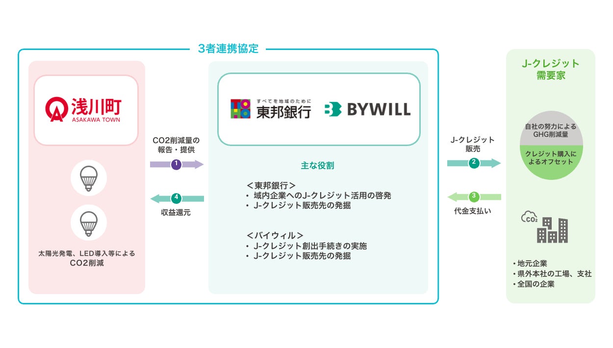 バイウィルは、浅川町におけるJ-クレジット創出プロジェクトの登録・申請からモニタリング、創出したクレジットの販売までをシームレスに支援します。また、販売に関しては、東邦銀行とも協力し、「地産地消」によって浅川町をはじめとする地域の脱炭素化を促進します。