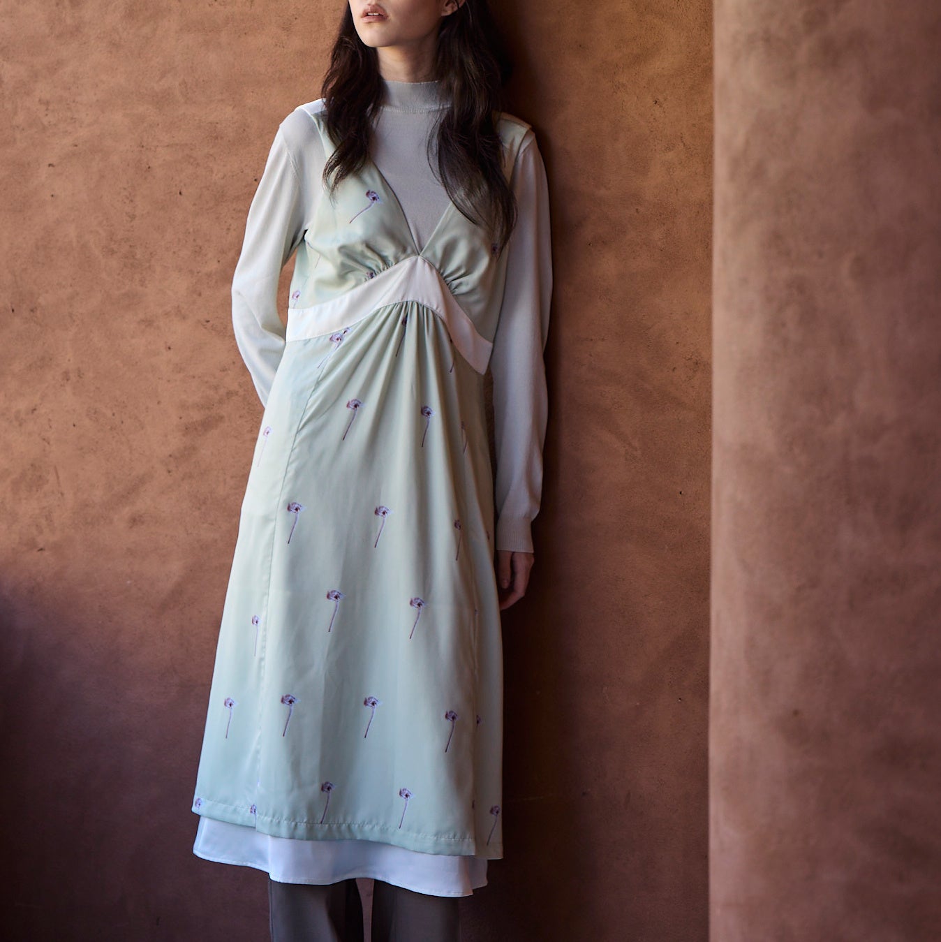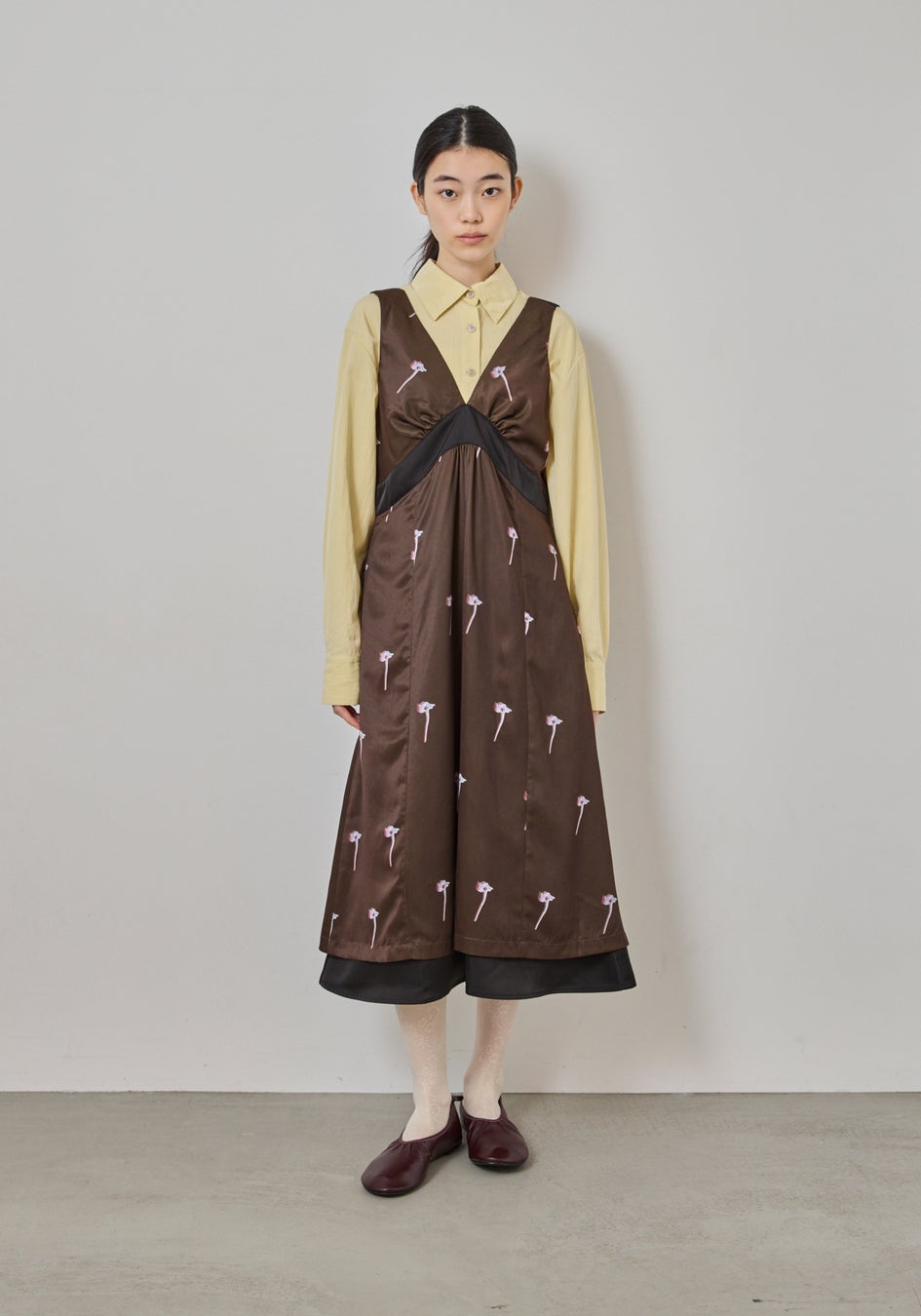 深いVラインが描く女性らしいシルエットに、繊細なフラワープリントが華やぎを添えるサロペットドレス。とろみのある素材が歩くたびにしなやかに揺れ、高めの切り替えがスタイルアップを叶えてくれます。日常はもちろん、特別なシーンにも軽やかに寄り添います。