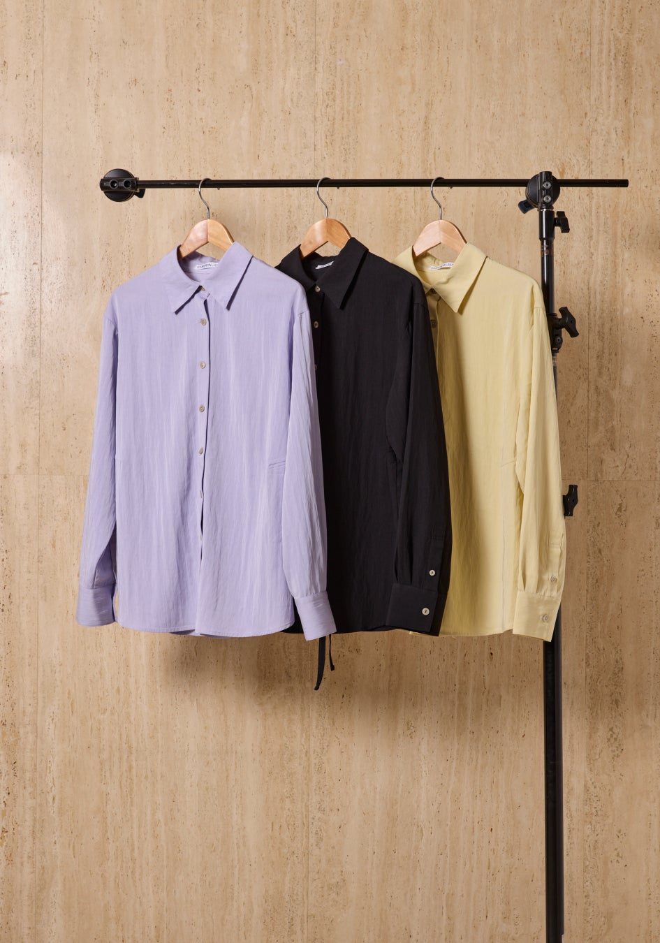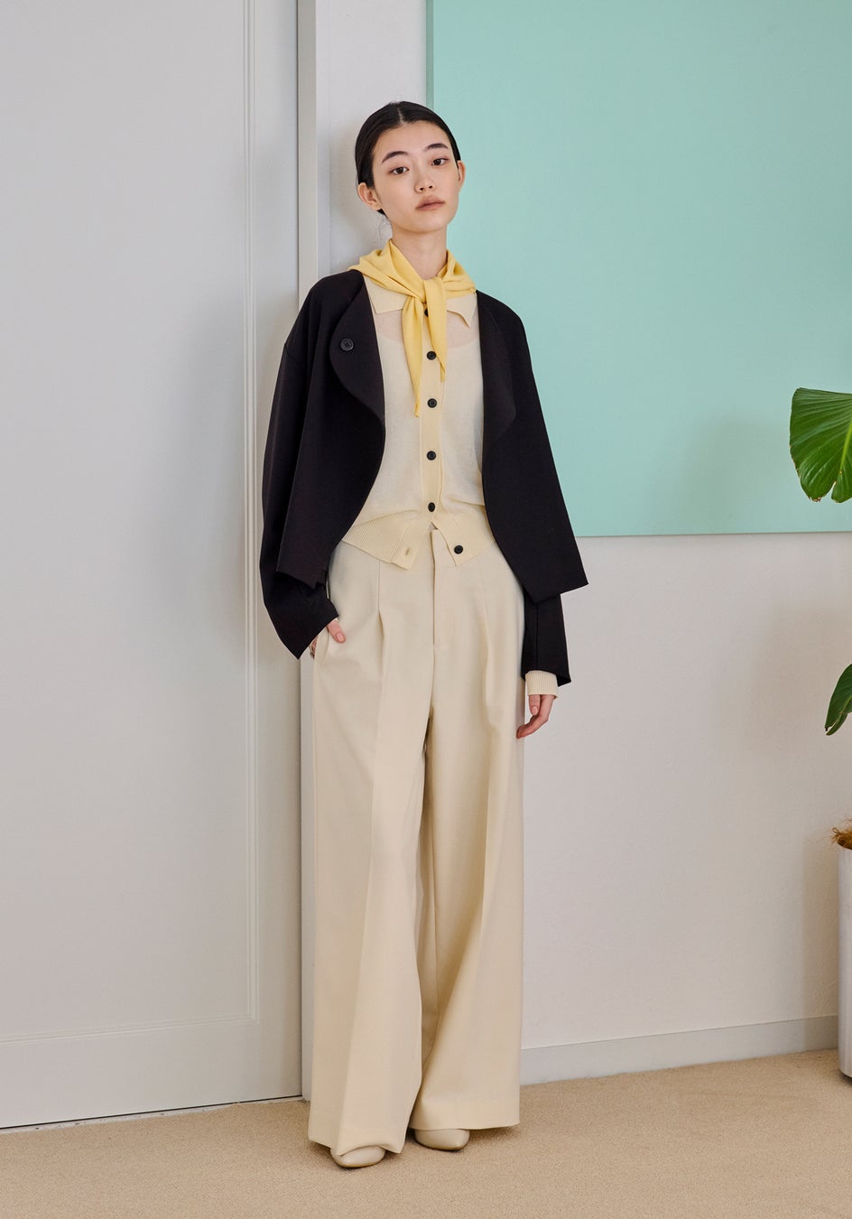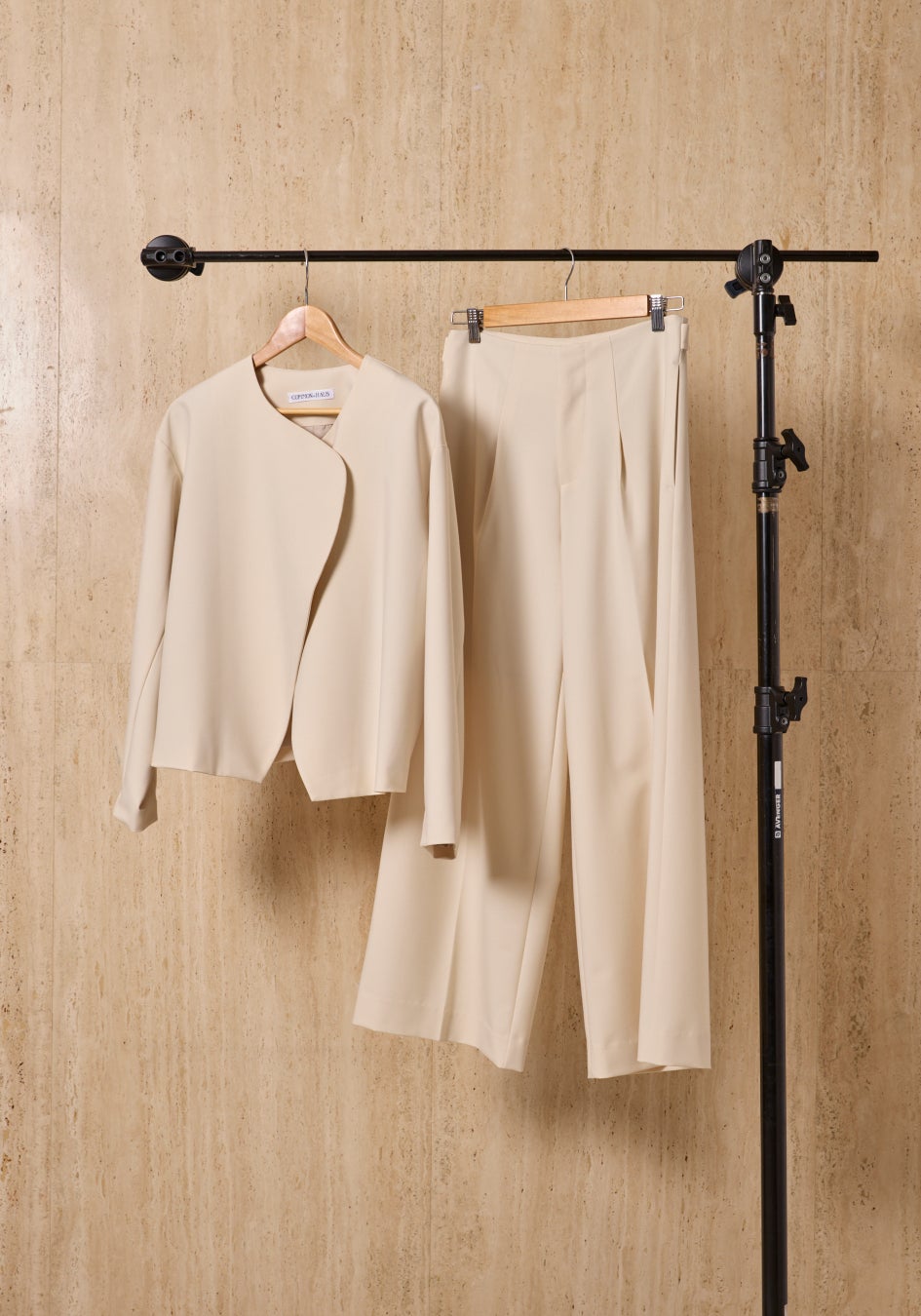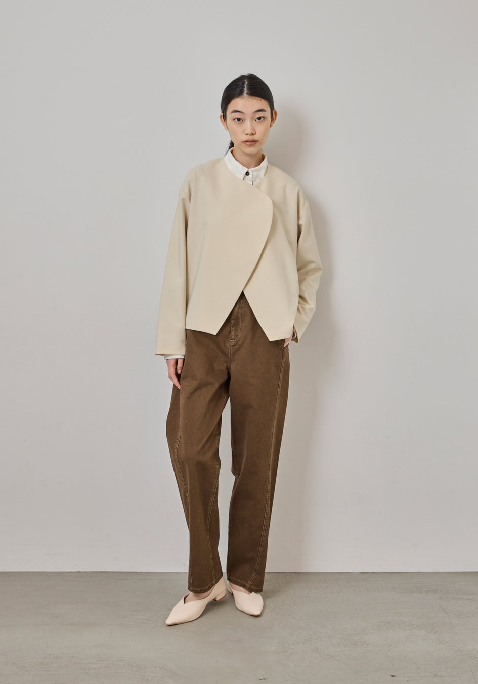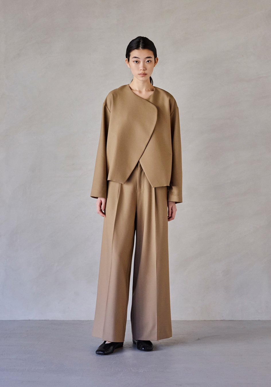 余分な装飾を排し、フォルムの美しさだけを際立たせたミニマルなセットアップ。ノーカラージャケットは、滑らかに重なるフロントラインが静かな強さを感じさせ、パンツはセンタープレスが描く直線が凛とした佇まいを生みます。ほどよい落ち感が体を包み込み、シルエットを計算されたままに整えてくれるのも魅力。フォーマルにもデイリーにも品よく馴染む、ワードローブの“軸”になるセットです。