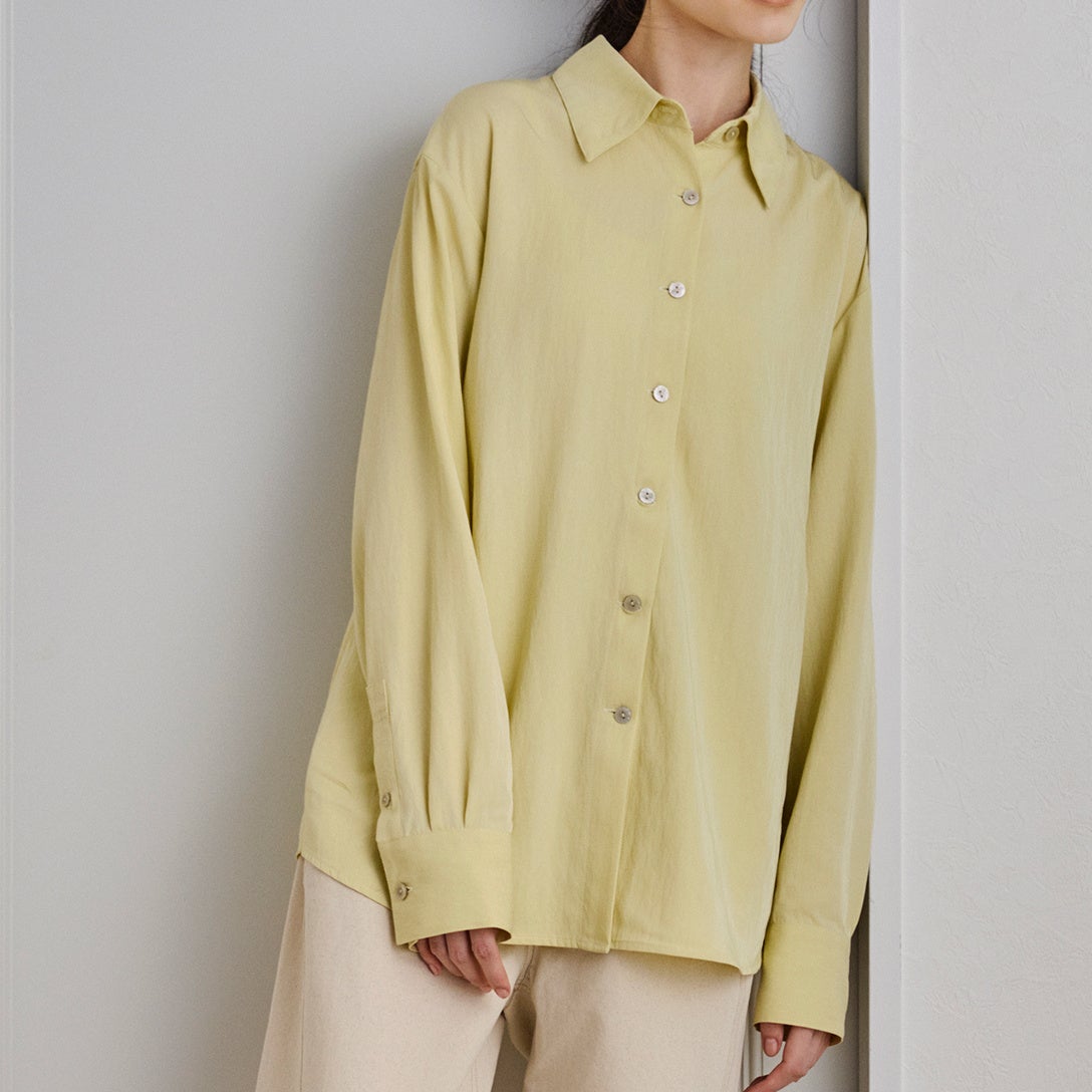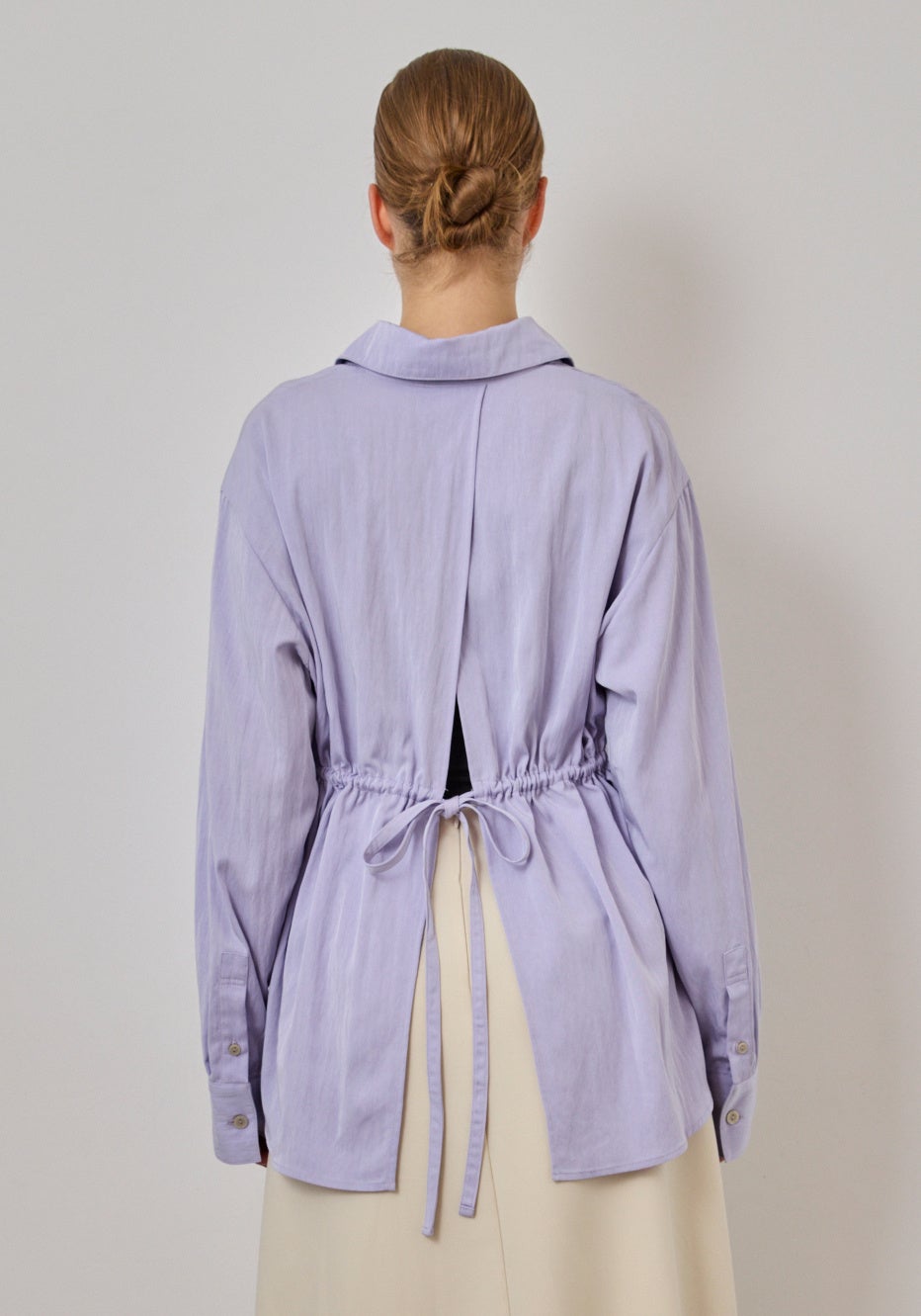 ふわりと空気をまとったような、軽やかなブラウス。正面はあえてシンプルに、背中には大胆なスリットとドロストコードを配し、立体的なギャザーがモードな陰影を添えます。長めのカフスやシャープな襟元が全体を端正に引き締め、一枚で存在感のあるスタイルへと導いてくれる一着です。