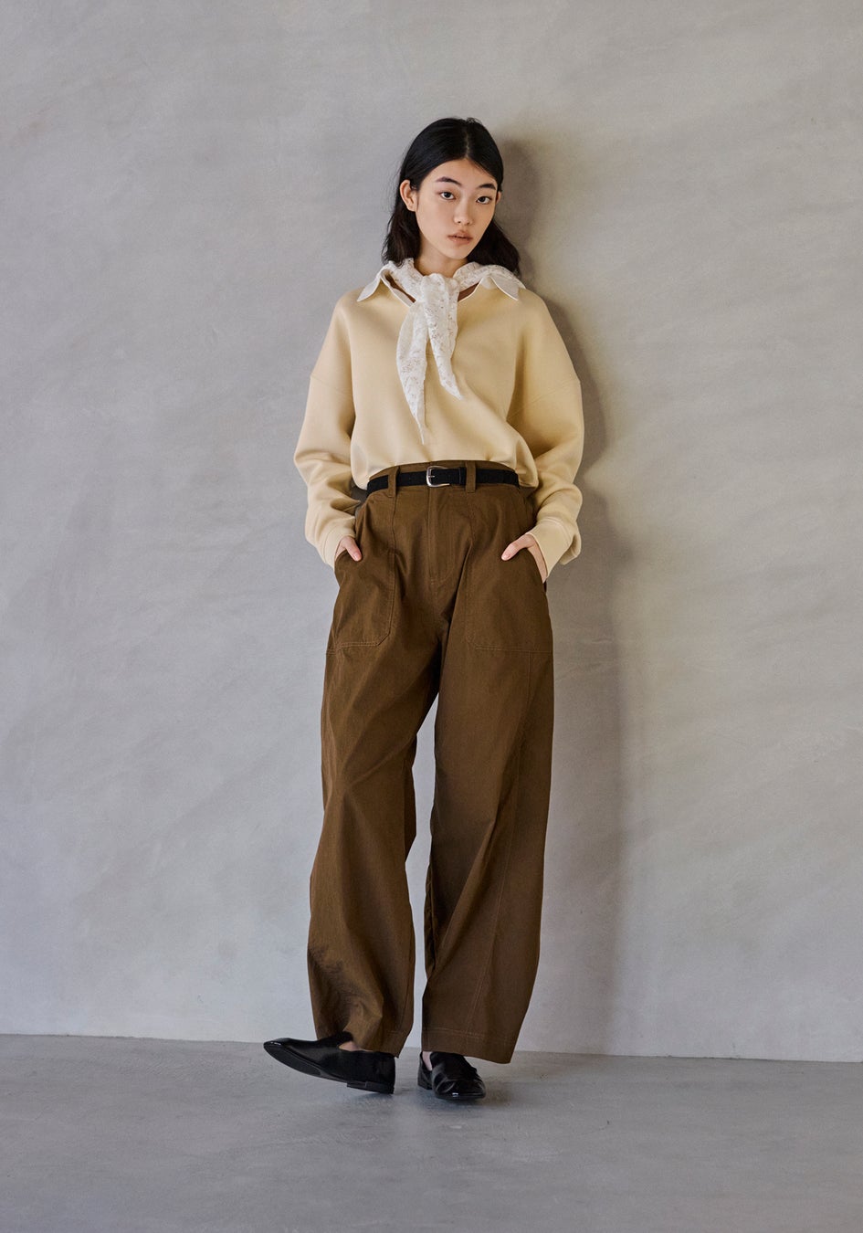 ほどよいゆとりのあるシルエットが身体を包み込み、カジュアルさの中に上品なムードを宿します。一枚で佇まいが整うバランスの良さが魅力で、日常のスタイルを品よく更新してくれるトップスです。