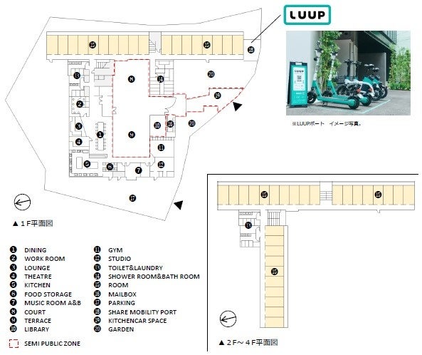 ラウンジ、ダイニング、シェアキッチン、ワークルーム、ライブラリー、テラス、中庭
