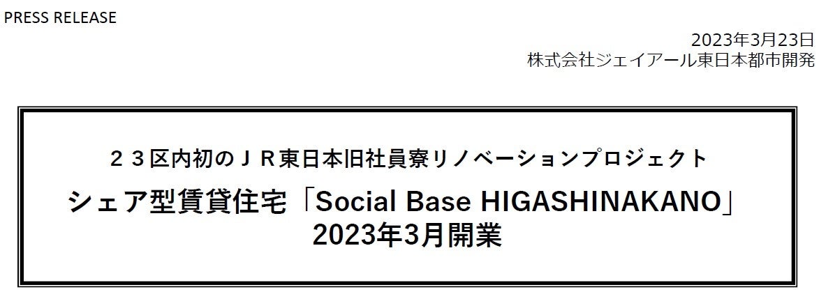 本計画は、東日本旅客鉄道株式会社が保有していた旧社員寮をリノベーションにより再生したシェア型賃貸住宅で、同タイプの資産活用例では23区内初となります。