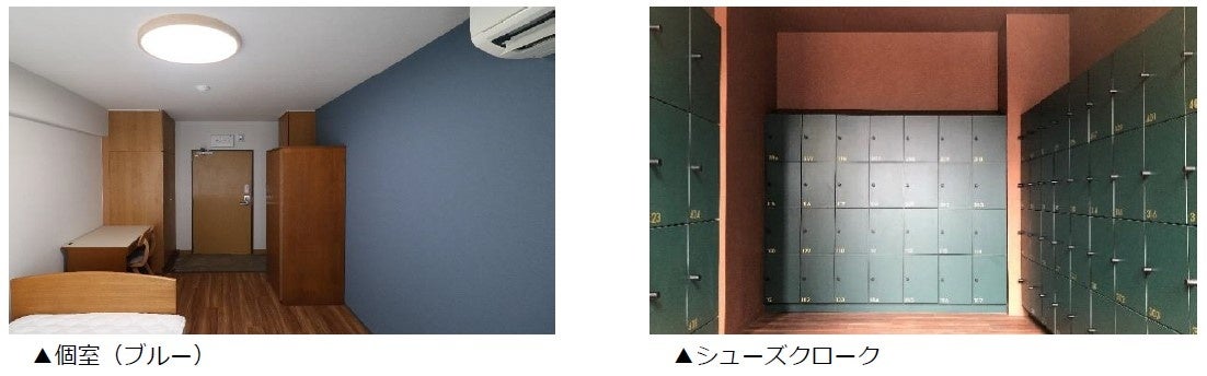 個室は、ベージュ、ブラウン、ブルーをアクセントとした3種類。全個室にベッド、テーブルセット、照明、エアコンを始めとした生活に必要となる家具類 とインターネット環境を備えています。